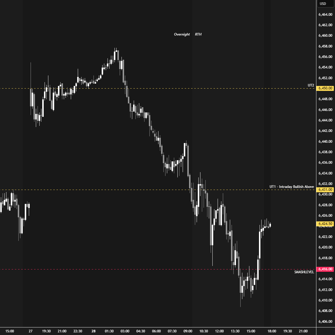 The yellow levels highlighted at the bottom left of the chart are the primary intraday levels I focus on. To avoid impulsive decisions at poor trade locations, I follow a simple but effective rule: exercise caution when initiating trades outside of these yellow levels.