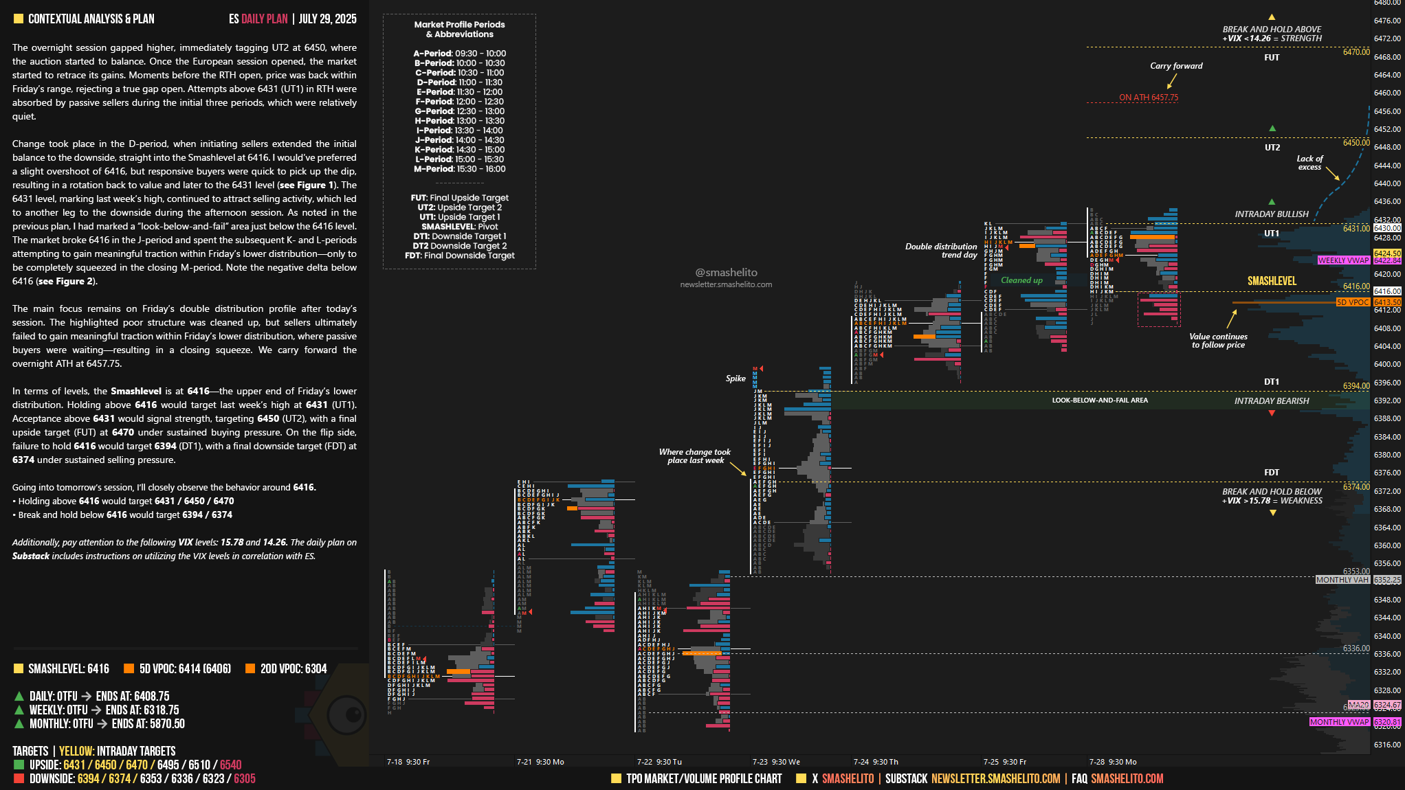 In terms of levels, the Smashlevel is at 6416—the upper end of Friday’s lower distribution. Holding above 6416 would target last week’s high at 6431 (UT1). Acceptance above 6431 would signal strength, targeting 6450 (UT2), with a final upside target (FUT) at 6470 under sustained buying pressure. On the flip side, failure to hold 6416 would target 6394 (DT1), with a final downside target (FDT) at 6374 under sustained selling pressure.