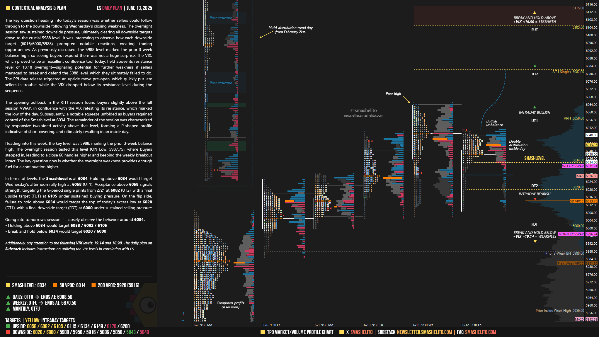 The opening pullback in the RTH session found buyers slightly above the full session VWAP, in confluence with the VIX retesting its resistance, which marked the low of the day. Subsequently, a notable squeeze unfolded as buyers regained control of the Smashlevel at 6034. The remainder of the session was characterized by responsive two-sided activity above that level, forming a P-shaped profile indicative of short covering, and ultimately resulting in an inside day.
