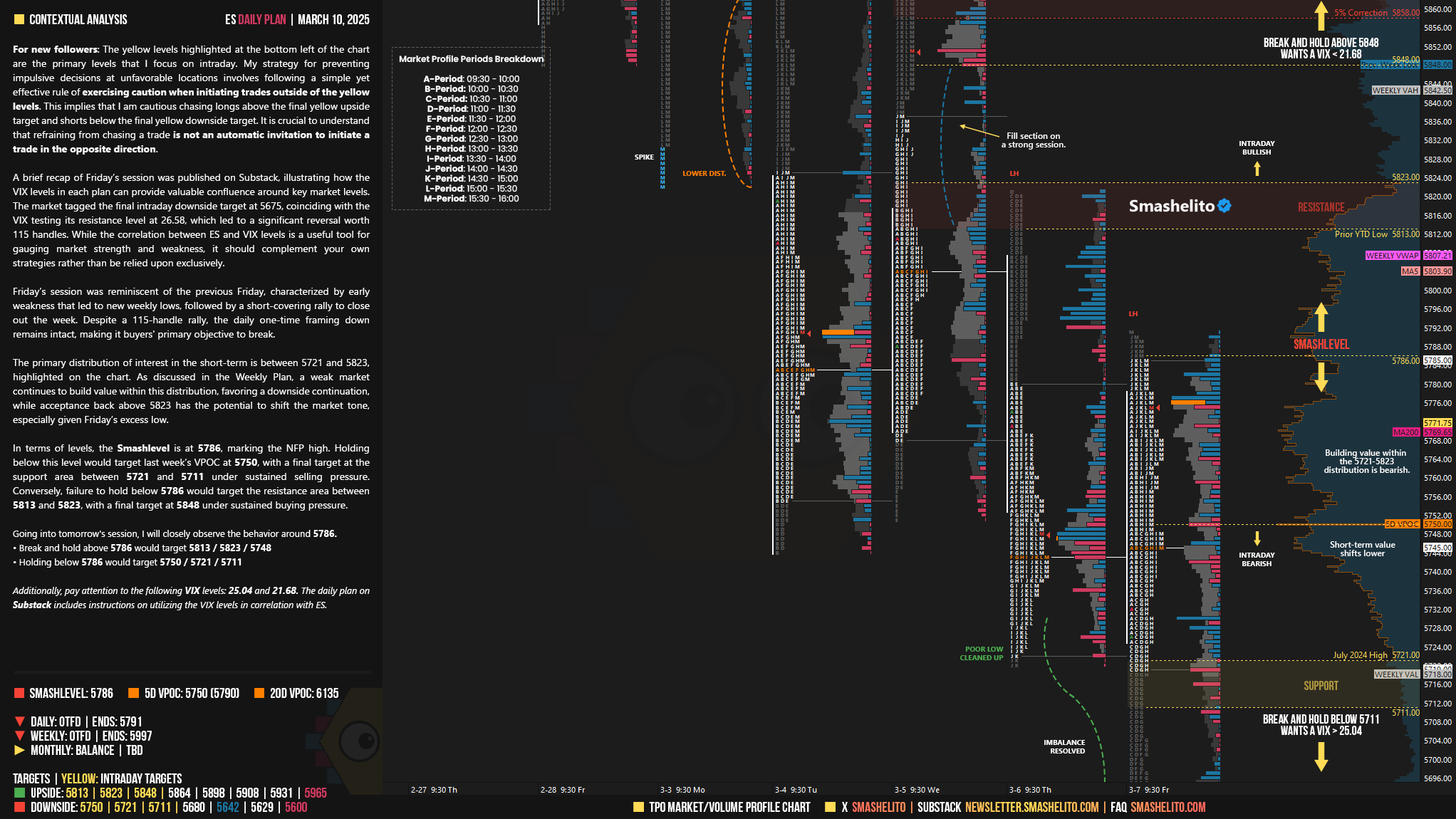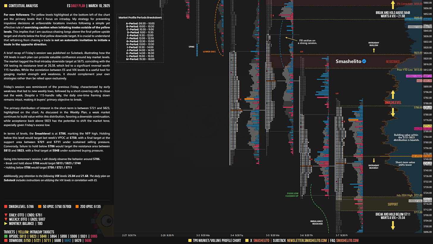 A brief recap of Friday’s session was published on Substack (link), illustrating how the VIX levels in each plan can provide valuable confluence around key market levels. The market tagged the final intraday downside target at 5675, coinciding with the VIX testing its resistance level at 26.58, which led to a significant reversal worth 115 handles. While the correlation between ES and VIX levels is a useful tool for gauging market strength and weakness, it should complement your own strategies rather than be relied upon exclusively.