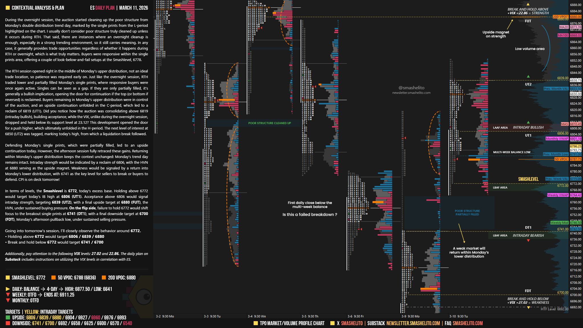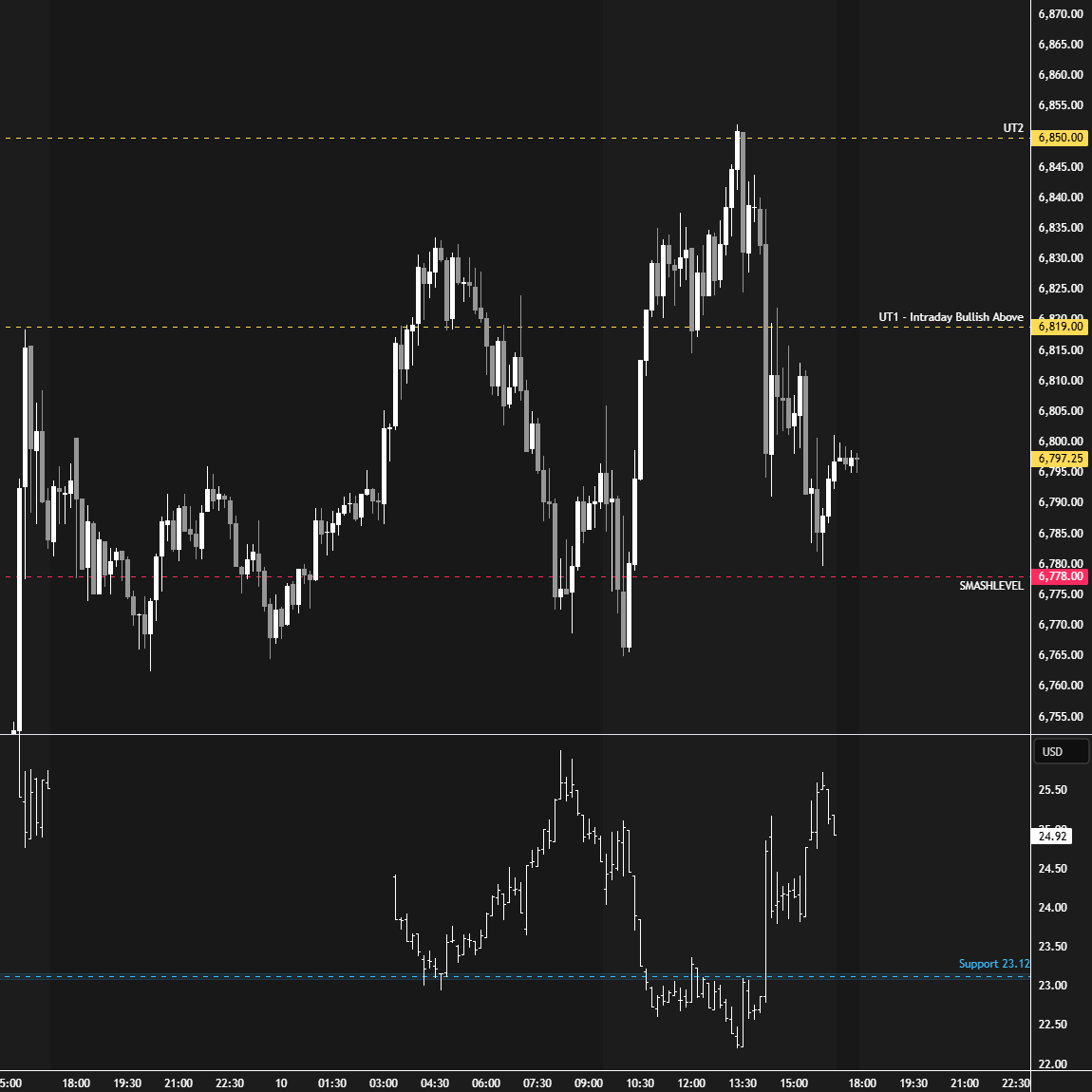 In terms of levels, the Smashlevel is 6772, today’s excess base. Holding above 6772 would target today’s IB high at 6806 (UT1). Acceptance above 6806 would signal intraday strength, targeting 6839 (UT2), with a final upside target at 6880 (FUT), the HVN, under sustained buying pressure.