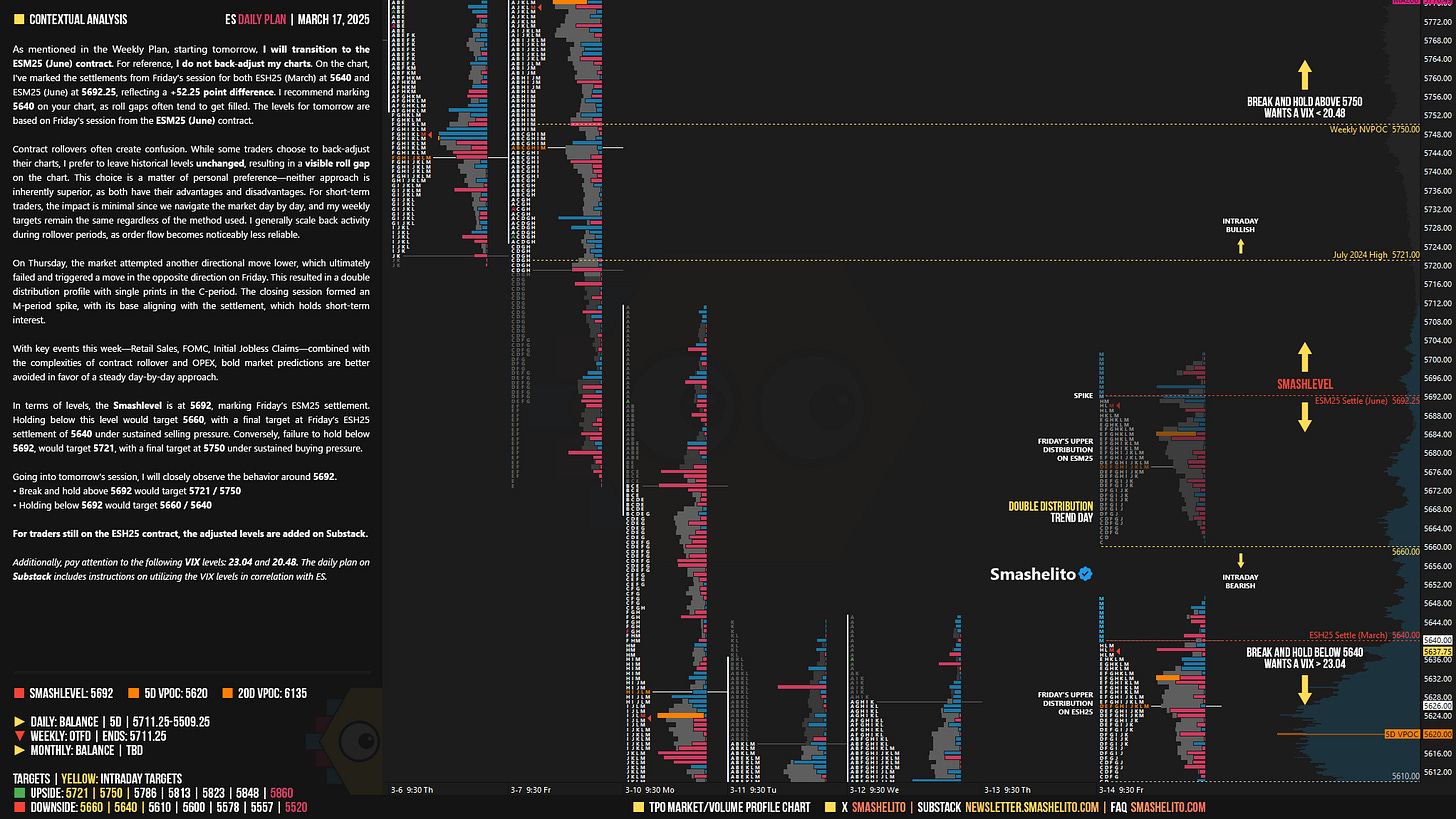 As mentioned in the Weekly Plan, starting tomorrow, I will transition to the ESM25 (June) contract. For reference, I do not back-adjust my charts. On the chart, I've marked the settlements from Friday's session for both ESH25 (March) at 5640 and ESM25 (June) at 5692.25, reflecting a +52.25 point difference. I recommend marking 5640 on your chart, as roll gaps often tend to get filled. The levels for tomorrow are based on Friday's session from the ESM25 (June) contract.