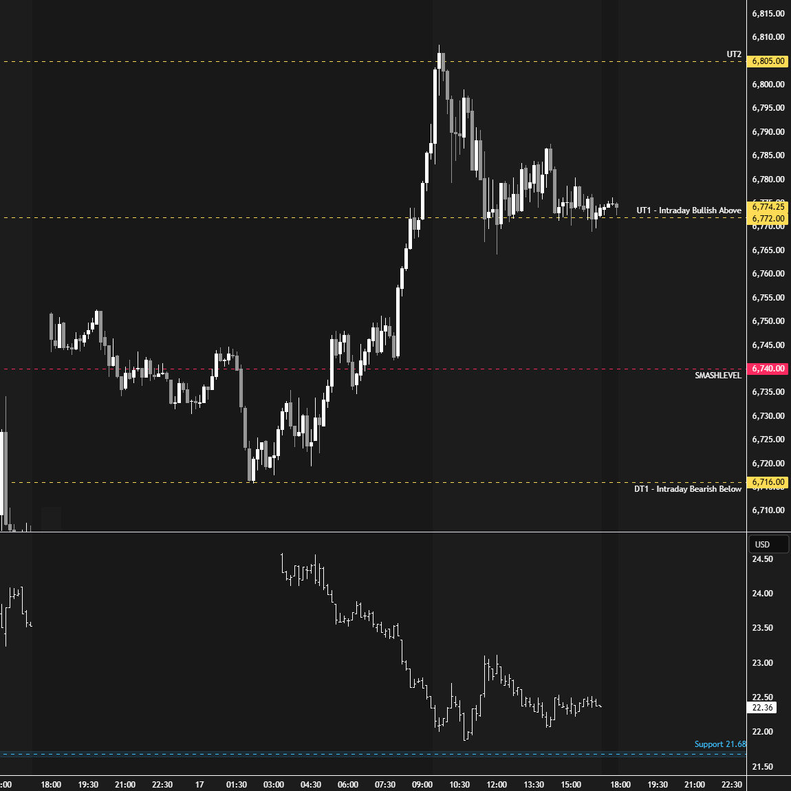 In terms of levels, the Smashlevel is 6787, the afternoon rally high. Holding below 6787 would target Monday’s VPOC at 6756 (DT1). Acceptance below 6756 would signal intraday weakness, targeting 6720 (DT2), with a final downside target at 6692 (FDT), the HTF level, under sustained selling pressure.