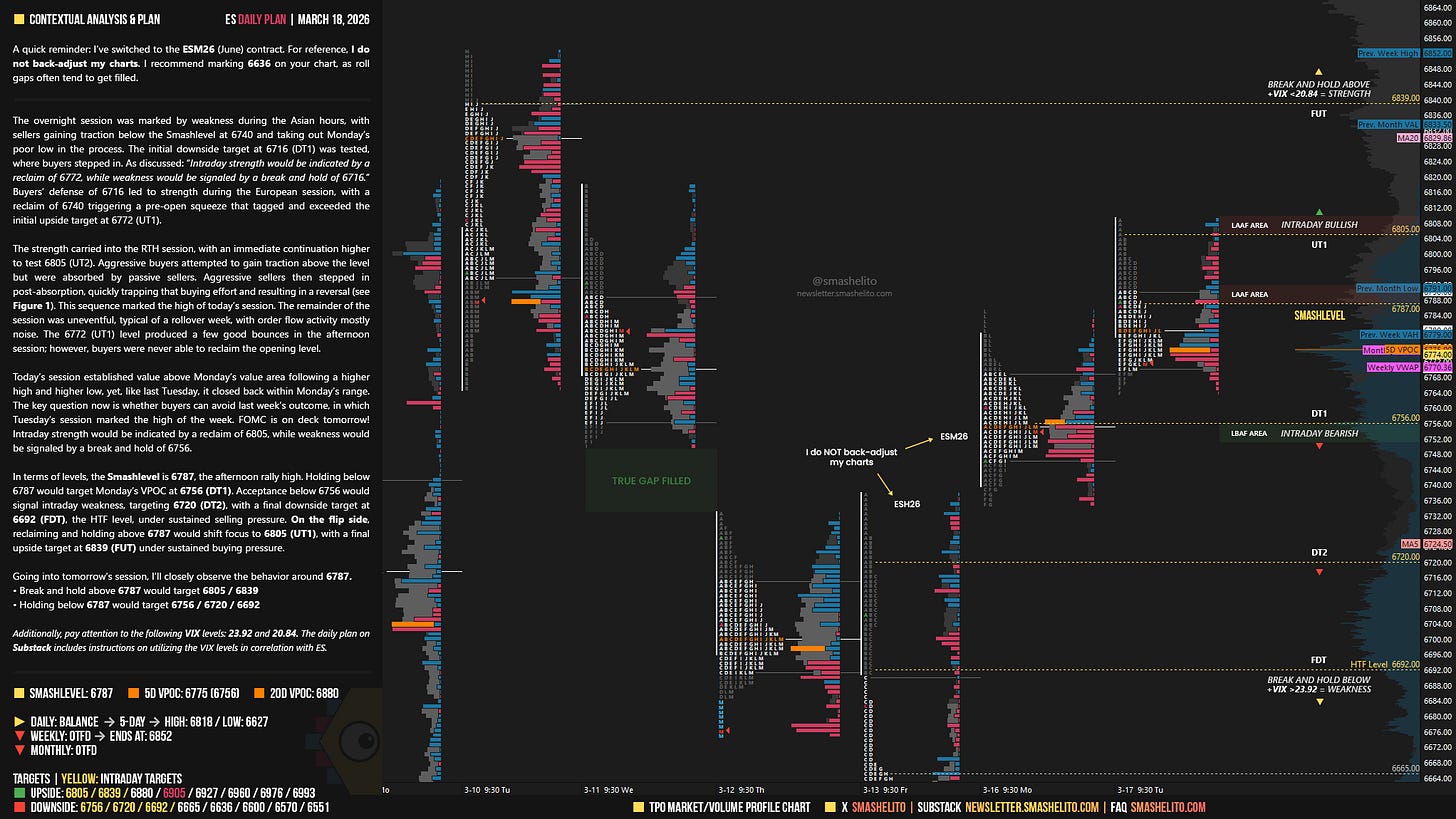 A quick reminder: I’ve switched to the ESM26 (June) contract. For reference, I do not back-adjust my charts. I recommend marking 6636 on your chart, as roll gaps often tend to get filled.