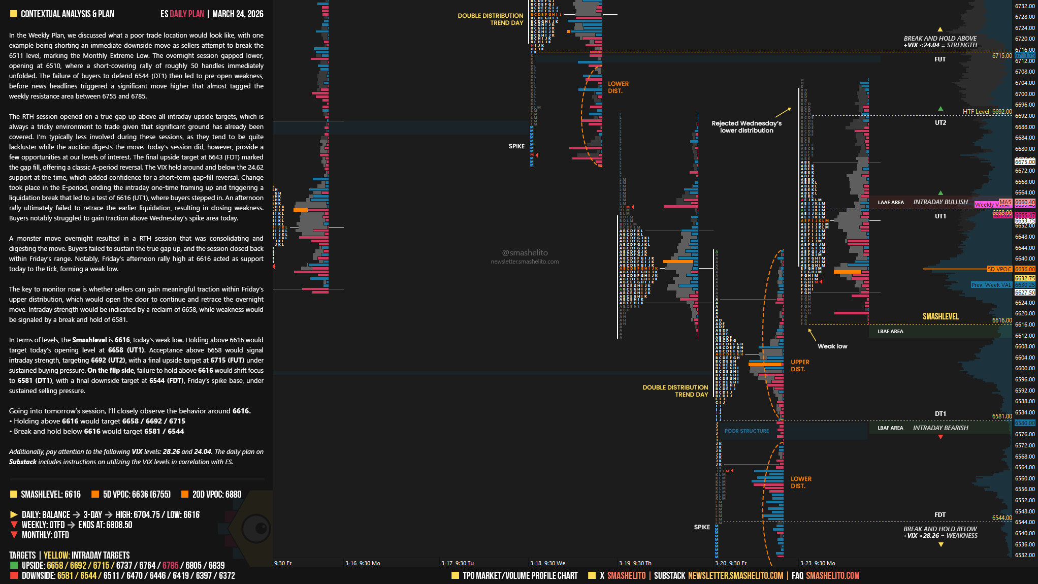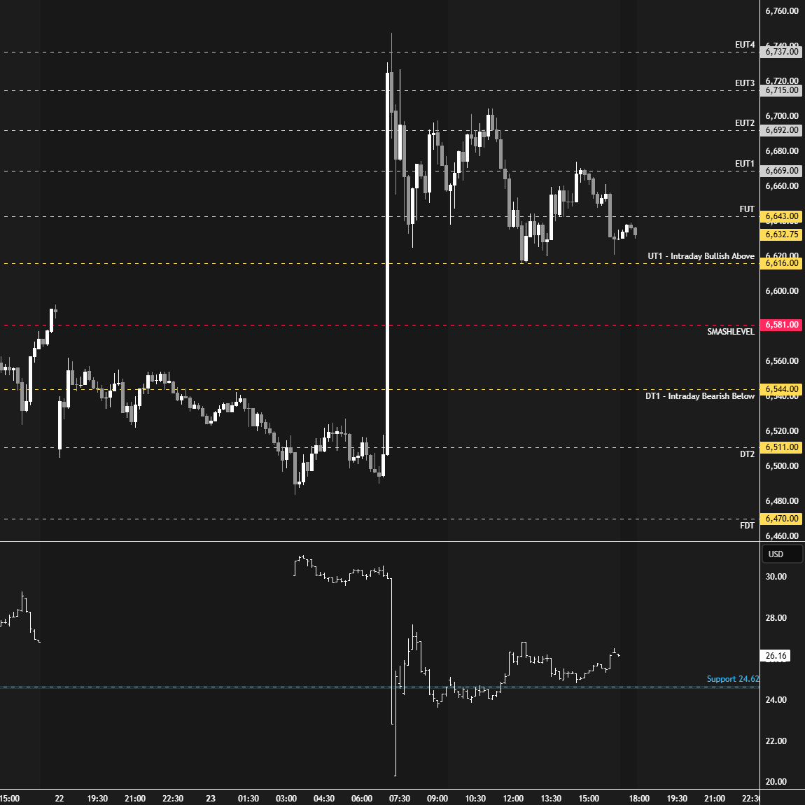 In terms of levels, the Smashlevel is 6616, today’s weak low. Holding above 6616 would target today’s opening level at 6658 (UT1). Acceptance above 6658 would signal intraday strength, targeting 6692 (UT2), with a final upside target at 6715 (FUT) under sustained buying pressure.