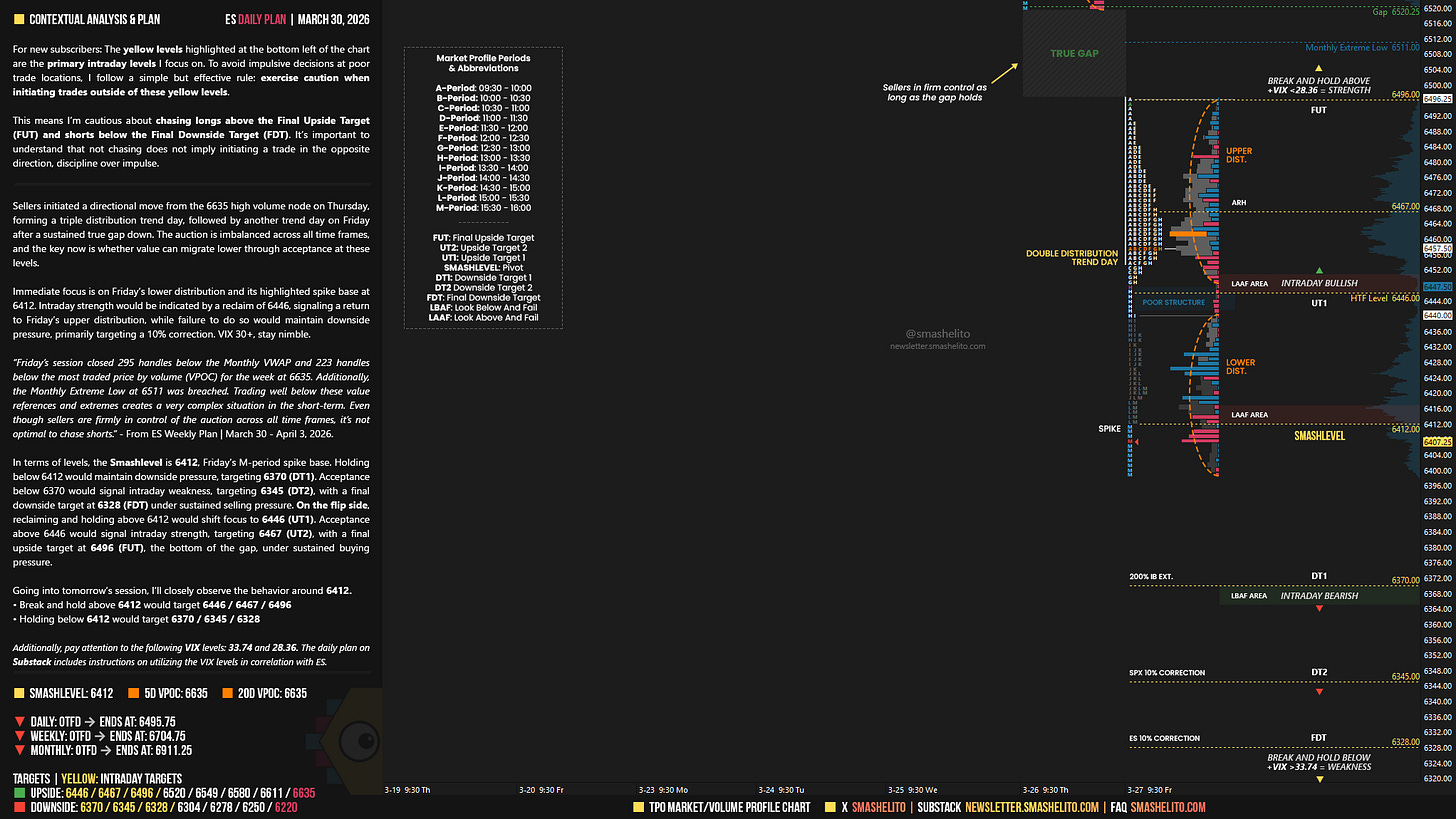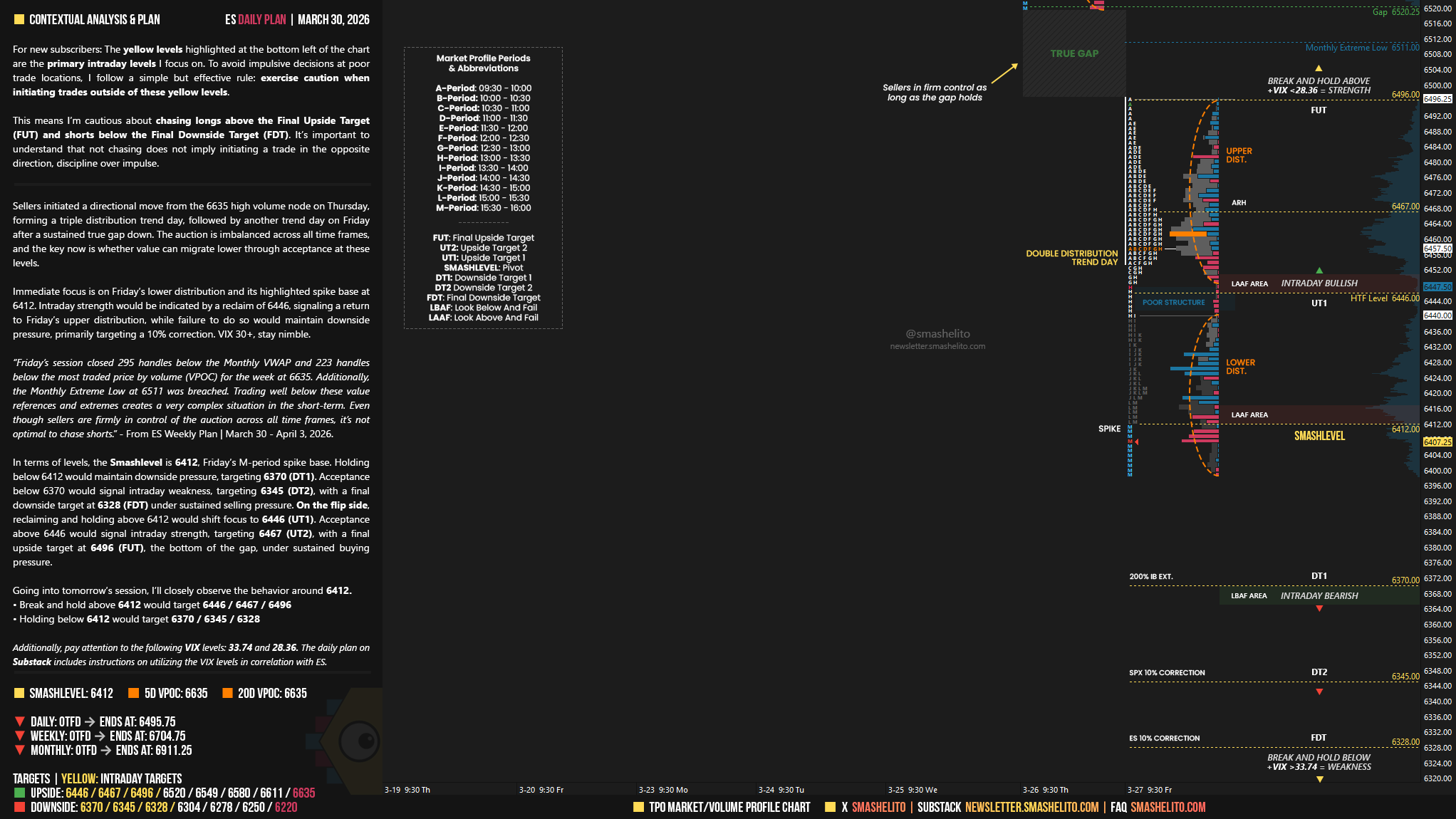 Sellers initiated a directional move from the 6635 high volume node on Thursday, forming a triple distribution trend day, followed by another trend day on Friday after a sustained true gap down. The auction is imbalanced across all time frames, and the key now is whether value can migrate lower through acceptance at these levels.