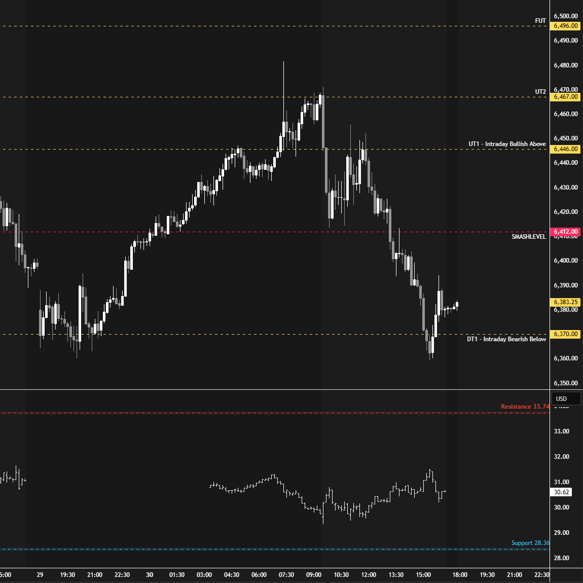 Intraday strength would be indicated by a reclaim of 6446 (UT1), signaling a return to Friday’s upper distribution, while weakness would be signaled by a break and hold below 6367 (DT1).