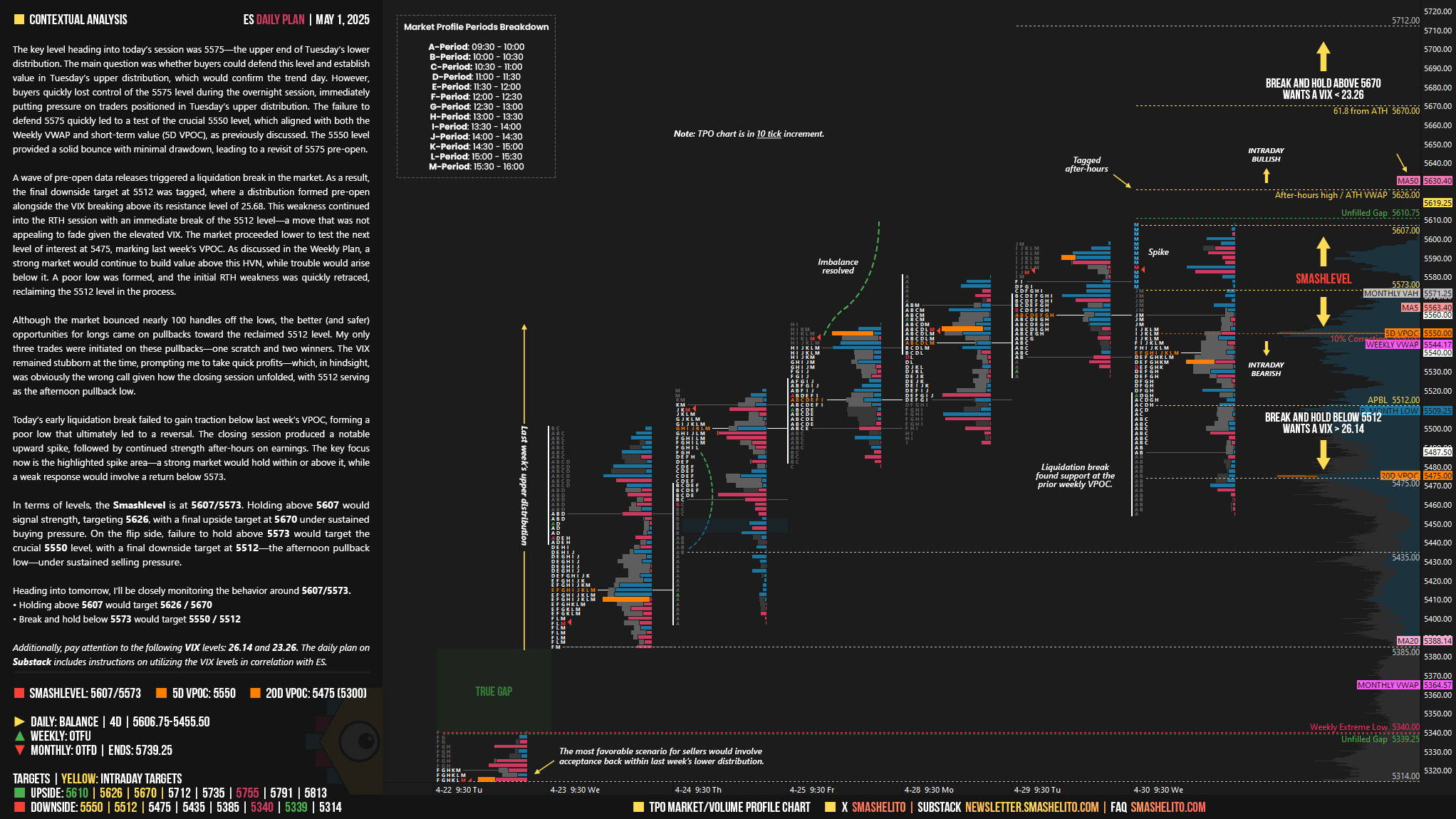 A wave of pre-open data releases triggered a liquidation break in the market. As a result, the final downside target at 5512 was tagged, where a distribution formed pre-open alongside the VIX breaking above its resistance level of 25.68. This weakness continued into the RTH session with an immediate break of the 5512 level—a move that was not appealing to fade given the elevated VIX. The market proceeded lower to test the next level of interest at 5475, marking last week’s VPOC. As discussed in the Weekly Plan, a strong market would continue to build value above this HVN, while trouble would arise below it. A poor low was formed, and the initial RTH weakness was quickly retraced, reclaiming the 5512 level in the process.