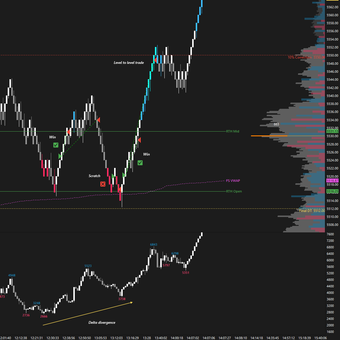 Although the market bounced nearly 100 handles off the lows, the better (and safer) opportunities for longs came on pullbacks toward the reclaimed 5512 level. My only three trades were initiated on these pullbacks—one scratch and two winners. The VIX remained stubborn at the time, prompting me to take quick profits—which, in hindsight, was obviously the wrong call given how the closing session unfolded, with 5512 serving as the afternoon pullback low.