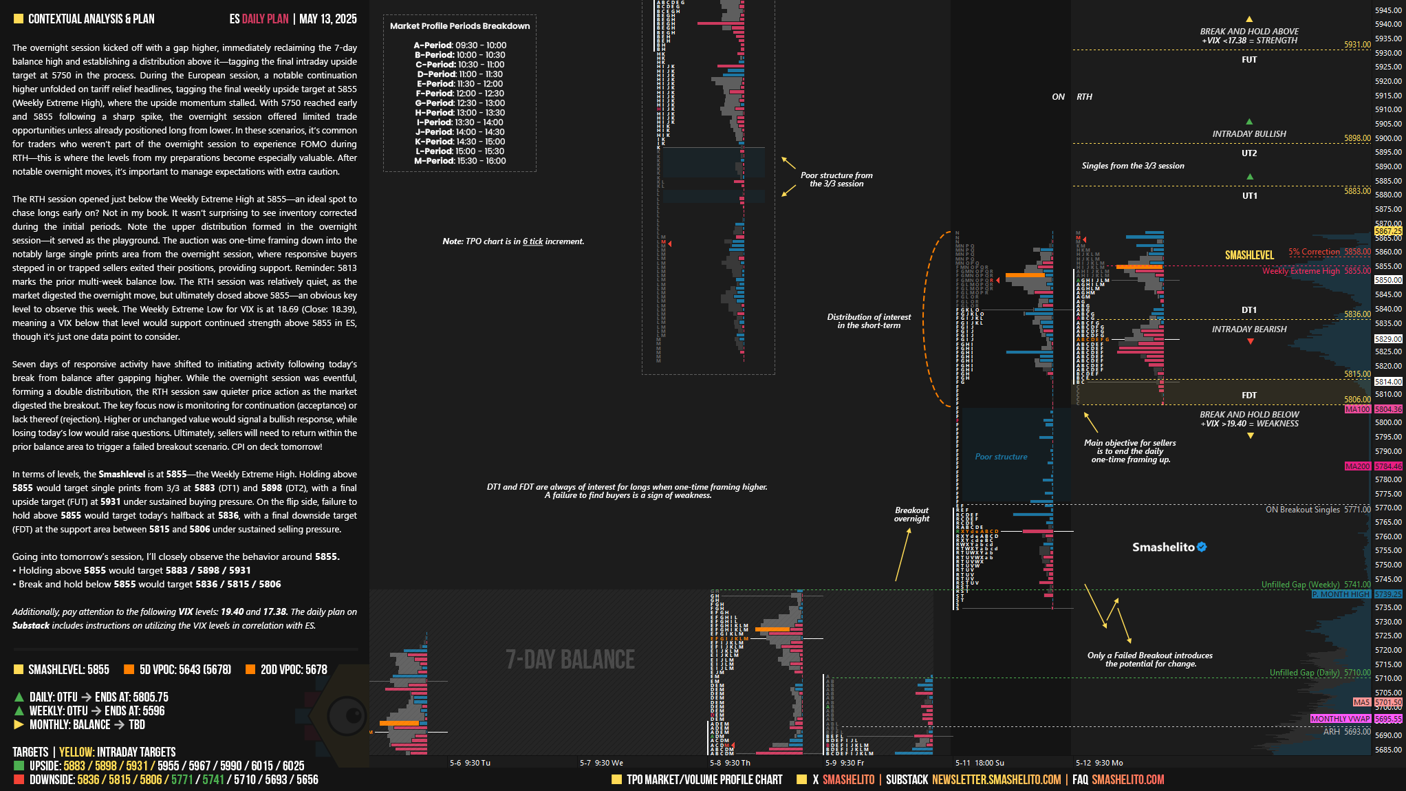 In terms of levels, the Smashlevel is at 5855—the Weekly Extreme High. Holding above 5855 would target single prints from 3/3 at 5883 (DT1) and 5898 (DT2), with a final upside target (FUT) at 5931 under sustained buying pressure. On the flip side, failure to hold above 5855 would target today’s halfback at 5836, with a final downside target (FDT) at the support area between 5815 and 5806 under sustained selling pressure.