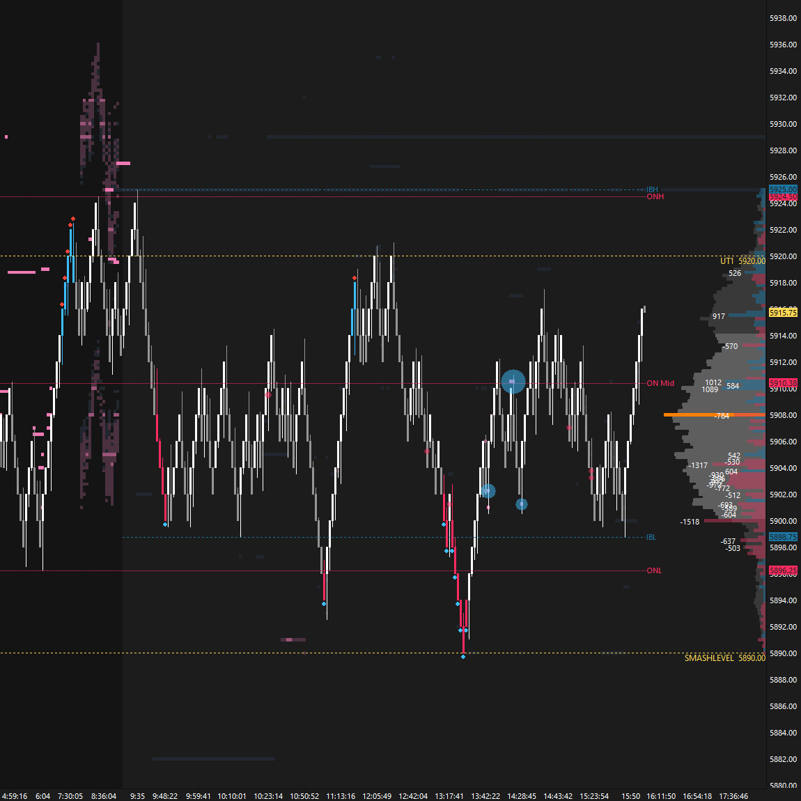 Quick update today, as the context remains unchanged following today’s inside day. The overnight session essentially traded within Tuesday’s main distribution, finding responsive buyers within the B-period single prints. The inability to fill this set of single prints was a weak sign from sellers, leading to a test of the initial upside target at 5920 (UT1), which capped the upside in both the overnight and RTH sessions.