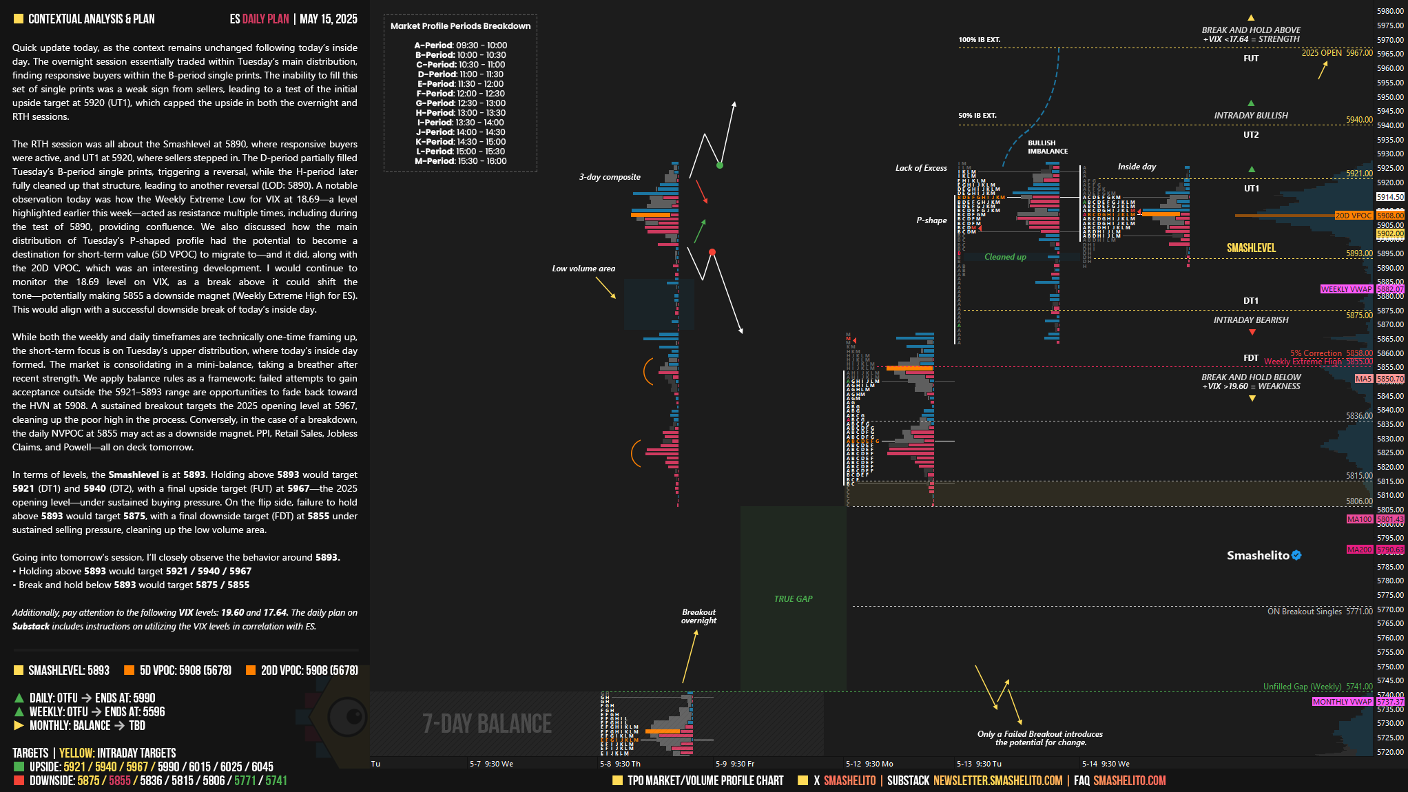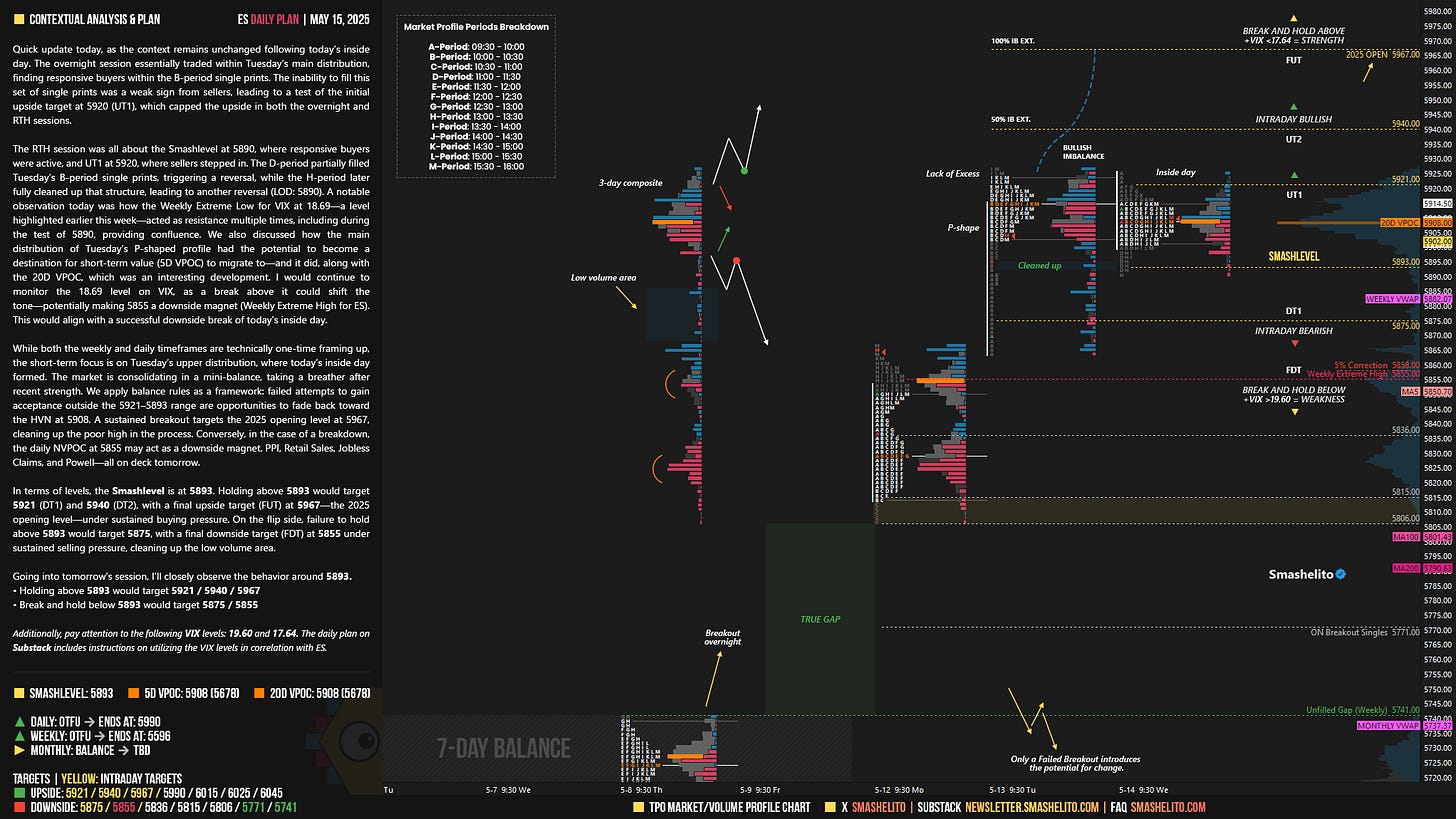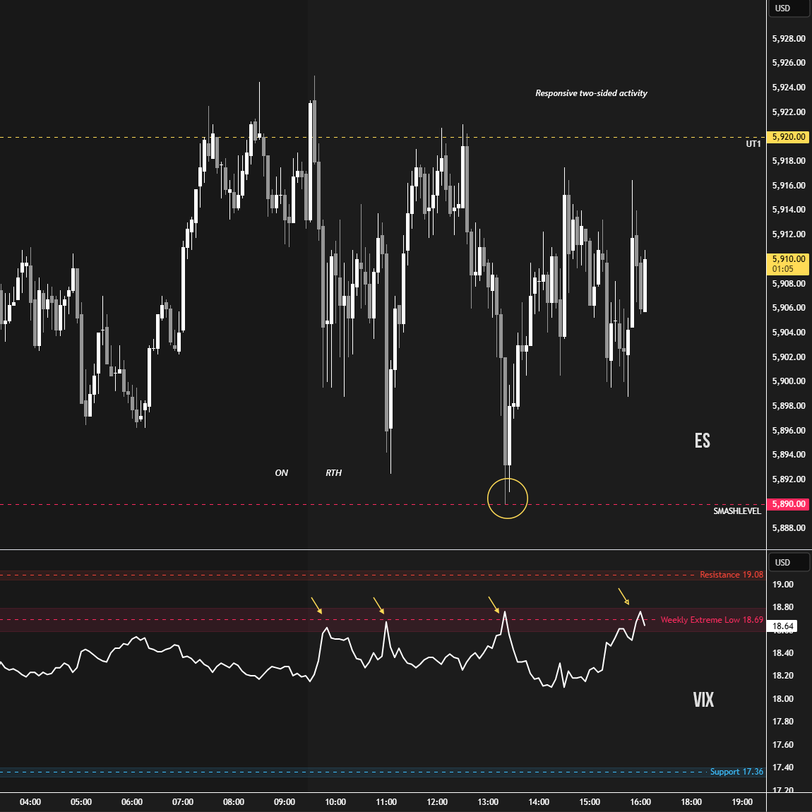 The RTH session was all about the Smashlevel at 5890, where responsive buyers were active, and UT1 at 5920, where sellers stepped in. The D-period partially filled Tuesday’s B-period single prints, triggering a reversal, while the H-period later fully cleaned up that structure, leading to another reversal (LOD: 5890). A notable observation today was how the Weekly Extreme Low for VIX at 18.69—a level highlighted earlier this week—acted as resistance multiple times, including during the test of 5890, providing confluence. We also discussed how the main distribution of Tuesday’s P-shaped profile had the potential to become a destination for short-term value (5D VPOC) to migrate to—and it did, along with the 20D VPOC, which was an interesting development. I would continue to monitor the 18.69 level on VIX, as a break above it could shift the tone—potentially making 5855 a downside magnet (Weekly Extreme High for ES). This would align with a successful downside break of today’s inside day.