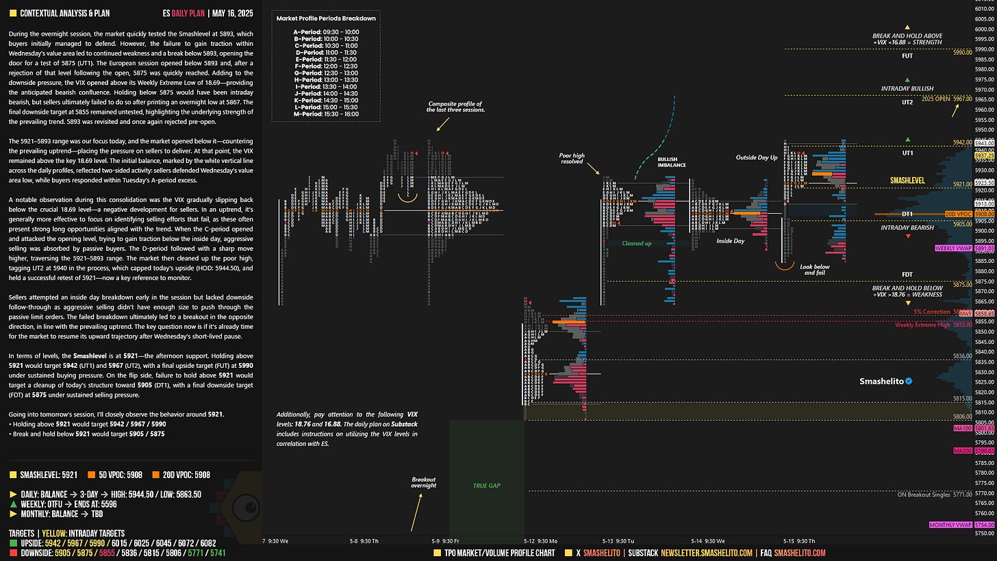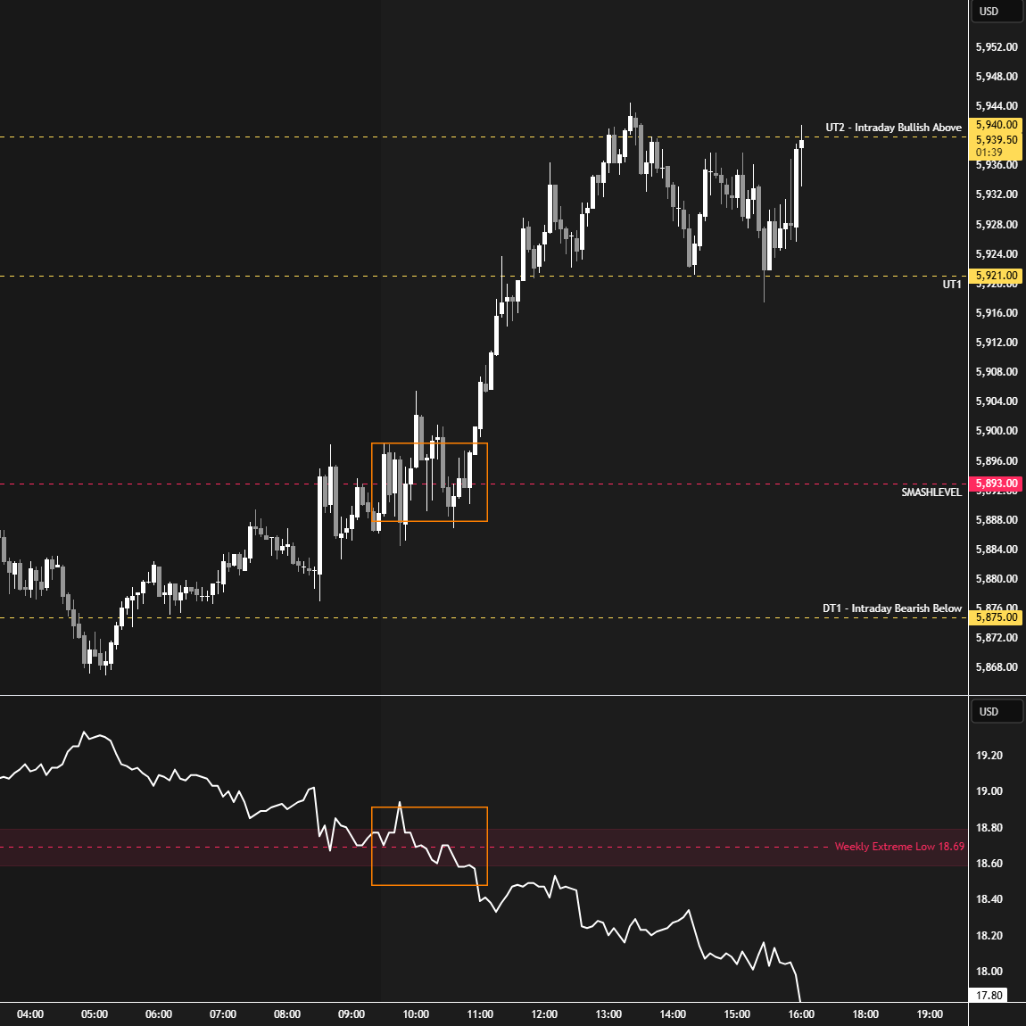 During the overnight session, the market quickly tested the Smashlevel at 5893, which buyers initially managed to defend. However, the failure to gain traction within Wednesday’s value area led to continued weakness and a break below 5893, opening the door for a test of 5875 (UT1). The European session opened below 5893 and, after a rejection of that level following the open, 5875 was quickly reached. Adding to the downside pressure, the VIX opened above its Weekly Extreme Low of 18.69—providing the anticipated bearish confluence. Holding below 5875 would have been intraday bearish, but sellers ultimately failed to do so after printing an overnight low at 5867. The final downside target at 5855 remained untested, highlighting the underlying strength of the prevailing trend. 5893 was revisited and once again rejected pre-open.