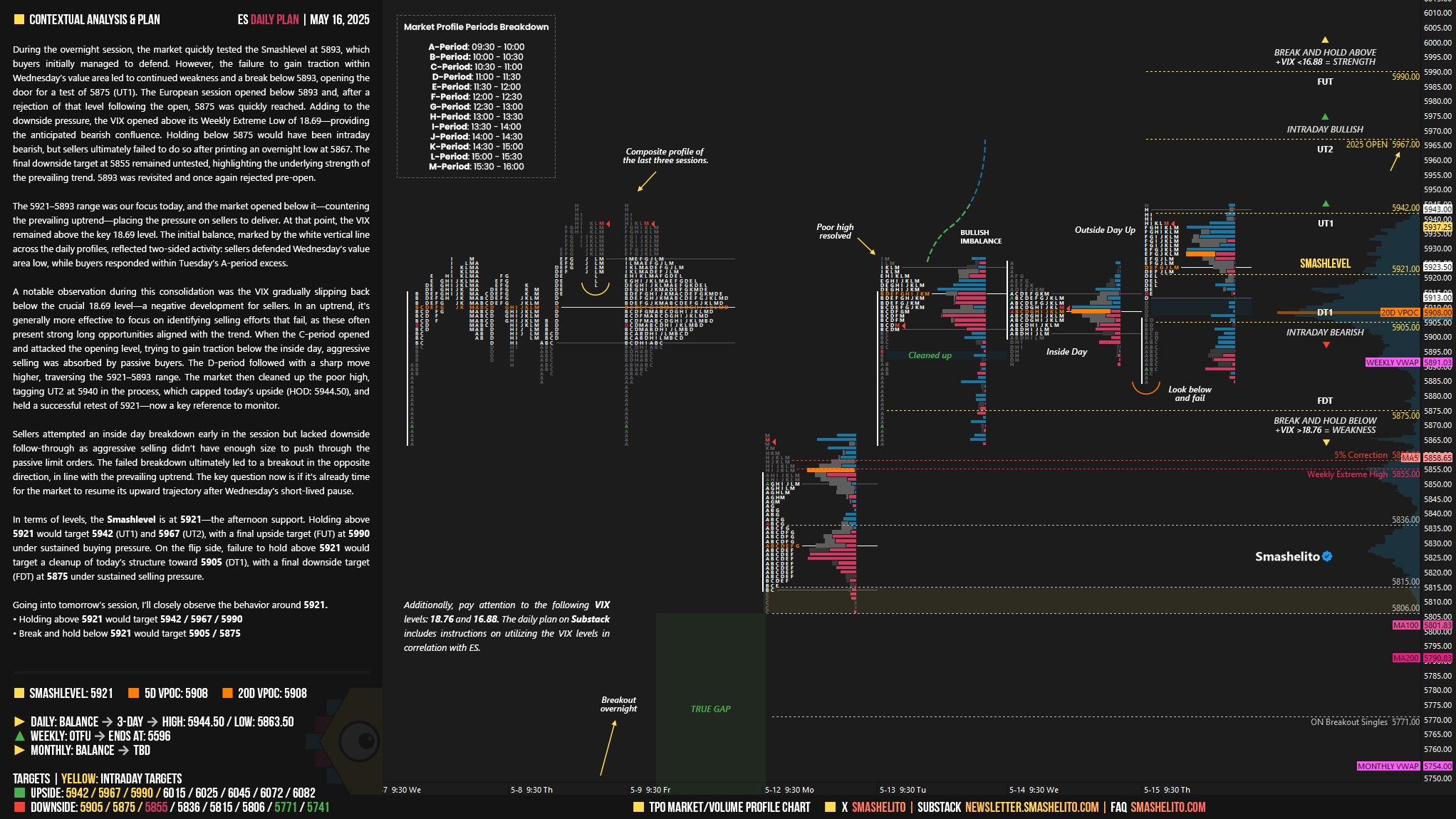 The 5921–5893 range was our focus today, and the market opened below it—countering the prevailing uptrend—placing the pressure on sellers to deliver. At that point, the VIX remained above the key 18.69 level. The initial balance, marked by the white vertical line across the daily profiles, reflected two-sided activity: sellers defended Wednesday’s value area low, while buyers responded within Tuesday’s A-period excess.