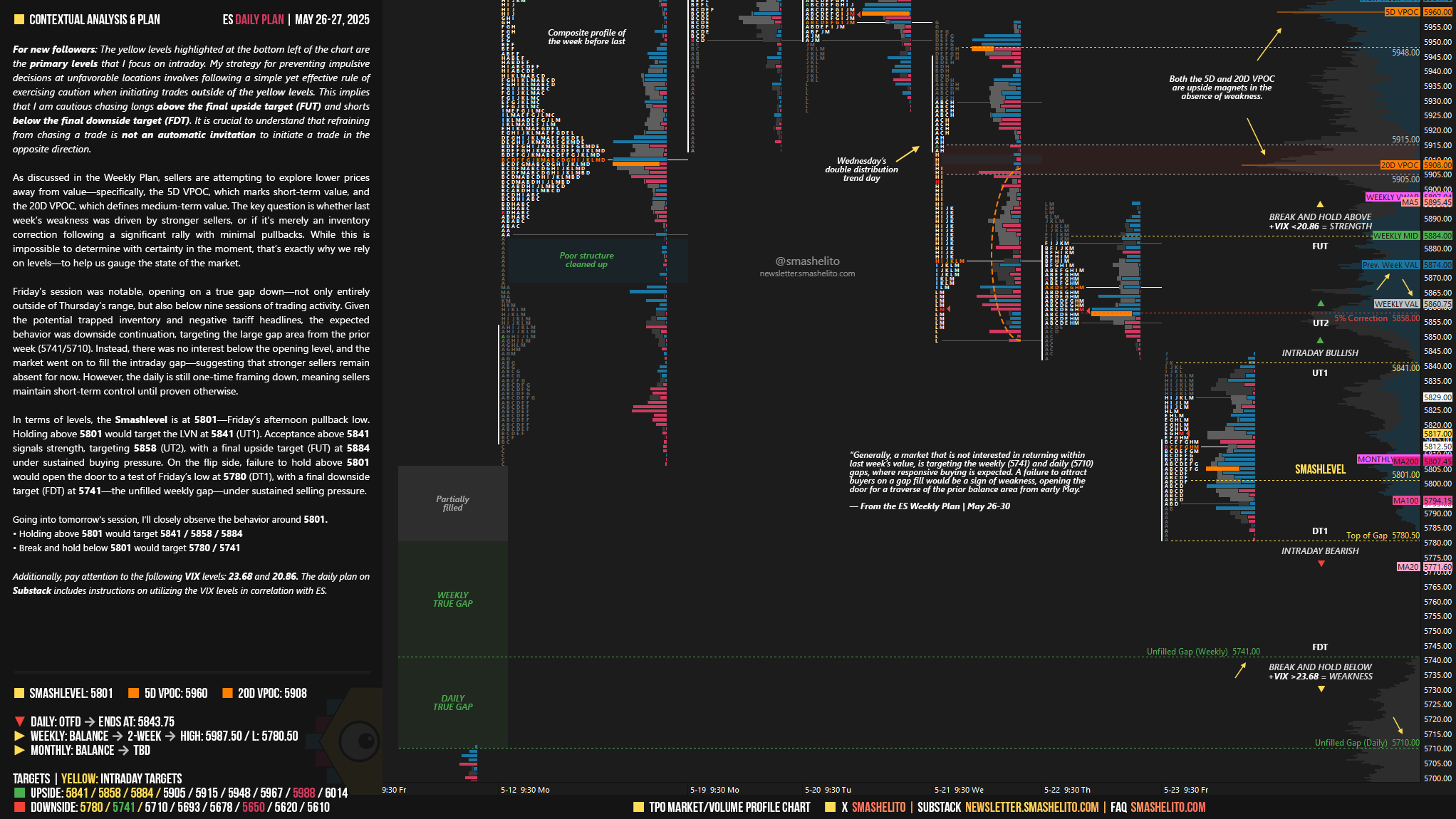 In terms of levels, the Smashlevel is at 5801—Friday’s afternoon pullback low. Holding above 5801 would target the LVN at 5841 (UT1). Acceptance above 5841 signals strength, targeting 5858 (UT2), with a final upside target (FUT) at 5884 under sustained buying pressure. On the flip side, failure to hold above 5801 would open the door to a test of Friday’s low at 5780 (DT1), with a final downside target (FDT) at 5741—the unfilled weekly gap—under sustained selling pressure.