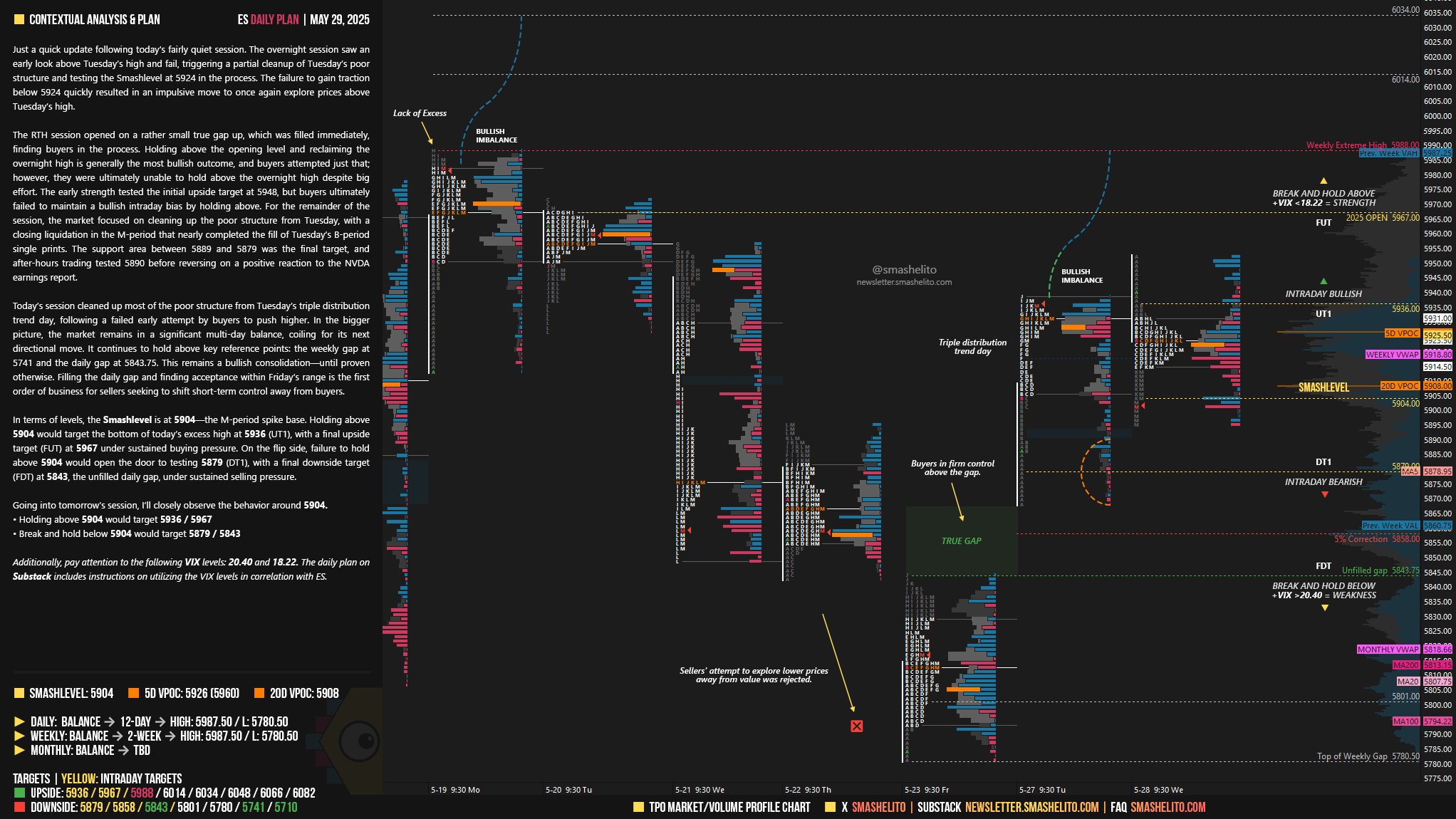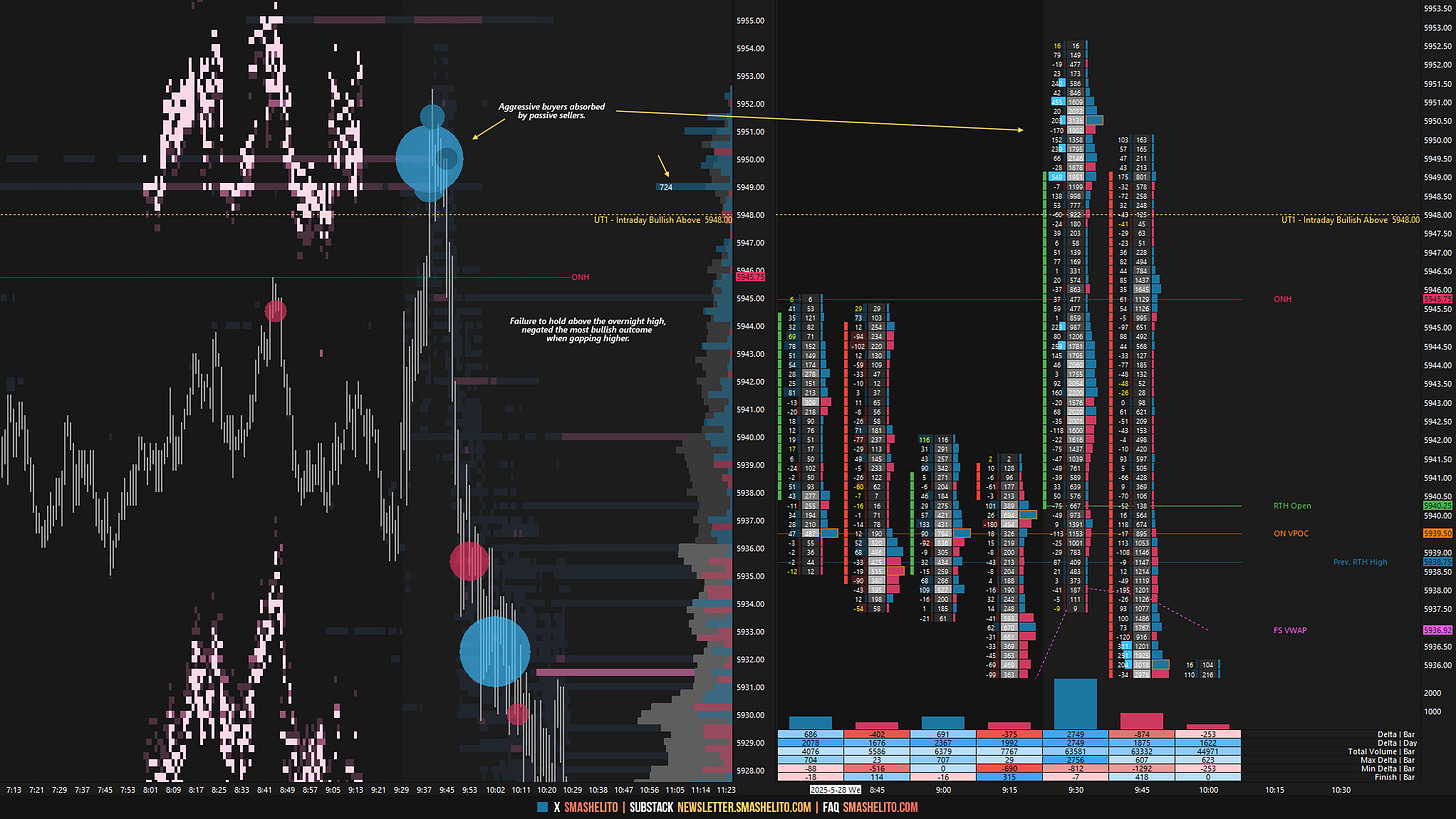 In terms of levels, the Smashlevel is at 5904—the M-period spike base. Holding above 5904 would target the bottom of today’s excess high at 5936 (UT1), with a final upside target (FUT) at 5967 under sustained buying pressure. On the flip side, failure to hold above 5904 would open the door to testing 5879 (DT1), with a final downside target (FDT) at 5843, the unfilled daily gap, under sustained selling pressure.