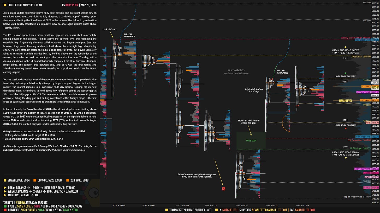 Today’s session cleaned up most of the poor structure from Tuesday’s triple distribution trend day, following a failed early attempt by buyers to push higher. In the bigger picture, the market remains in a significant multi-day balance, coiling for its next directional move. It continues to hold above key reference points: the weekly gap at 5741 and the daily gap at 5843.75. This remains a bullish consolidation—until proven otherwise. Filling the daily gap and finding acceptance within Friday’s range is the first order of business for sellers seeking to shift short-term control away from buyers.
