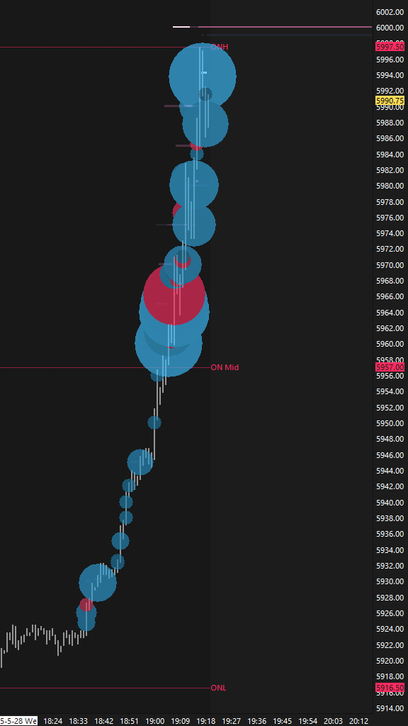The overnight session saw an immediate and significant move to the upside following another round of tariff headlines, resulting in not only clearing all intraday upside targets, but also tagging and exceeding the Weekly Extreme High at 5988 (see Figure 1). For new followers, the Weekly Extreme High is our final weekly upside target, as outlined in the Weekly Plan. After reclaiming the 5988 level, a distribution formed outside the current multi-day balance area. Trouble started to kick in for buyers during the European session, when a breakout from that distribution failed and the market dropped back below 5988—opening the door to a potential failed breakout scenario (see Figure 2). The market then quickly returned within Tuesday’s range ahead of the RTH open.
