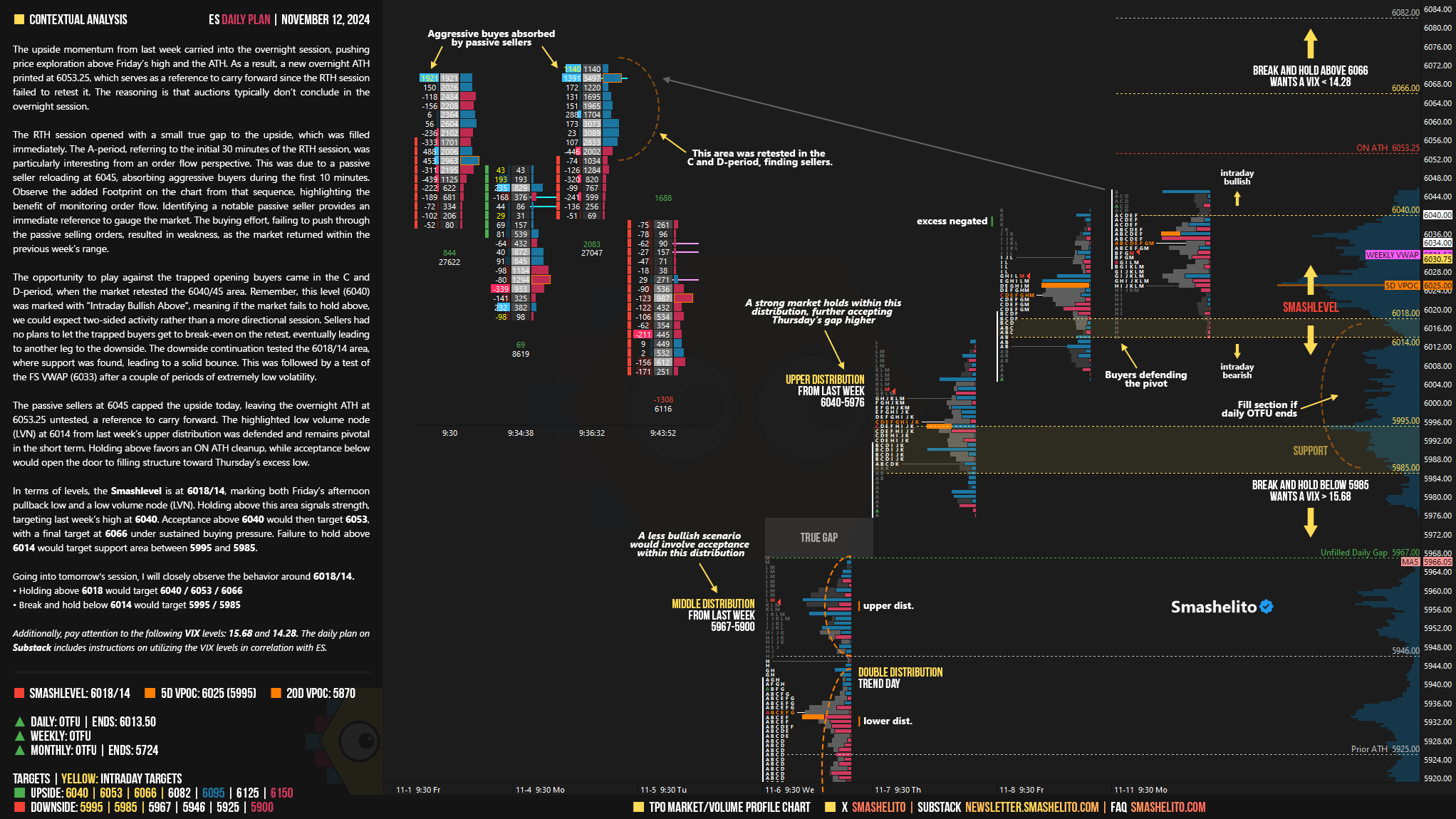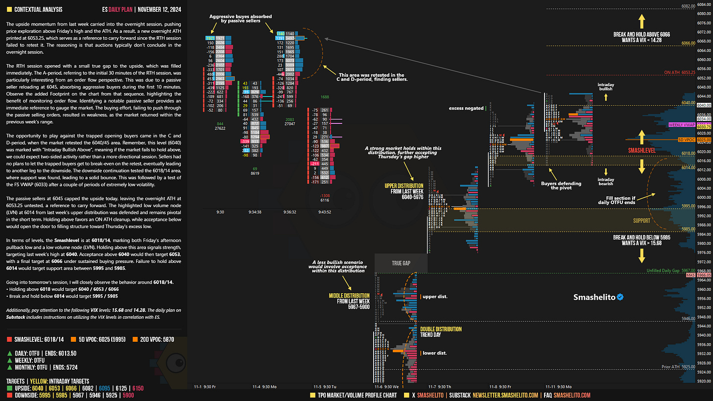 In terms of levels, the Smashlevel is at 6018/14, marking both Friday’s afternoon pullback low and a low volume node (LVN). Holding above this area signals strength, targeting last week’s high at 6040. Acceptance above 6040 would then target 6053, with a final target at 6066 under sustained buying pressure. Failure to hold above 6014 would target support area between 5995 and 5985.