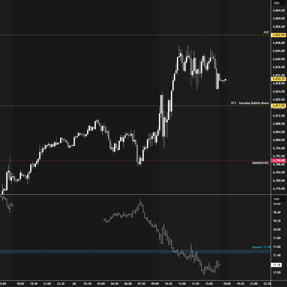 In terms of levels, the Smashlevel is 6824—the Initial Balance High. Holding above 6824 would target the unfilled gap at 6852 (UT1). Acceptance above 6852 would signal strength, targeting 6865 (UT2), with a final upside target (FUT) at 6885 under sustained buying pressure.