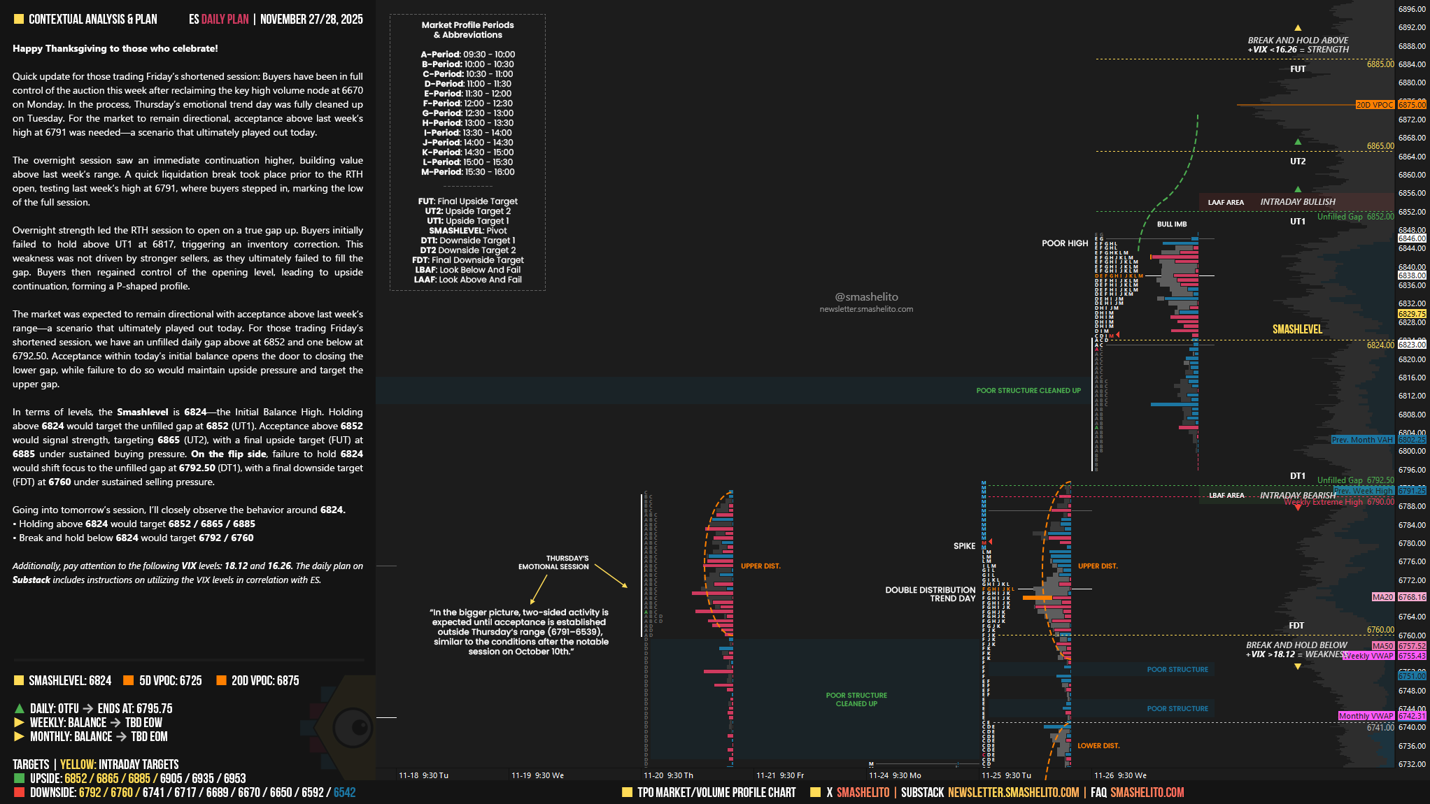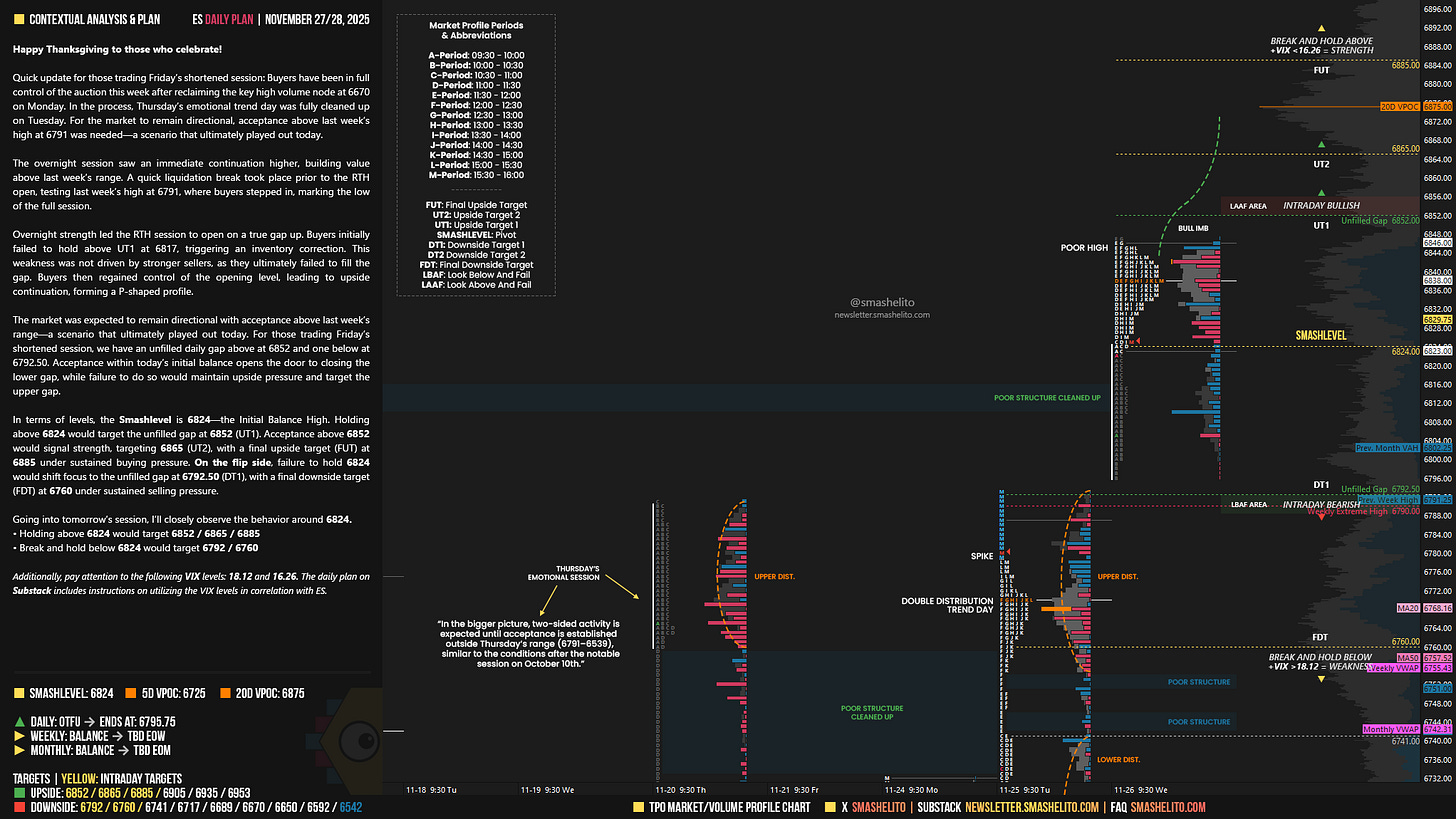 Quick update for those trading Friday’s shortened session: Buyers have been in full control of the auction this week after reclaiming the key high volume node at 6670 on Monday. In the process, Thursday’s emotional trend day was fully cleaned up on Tuesday. For the market to remain directional, acceptance above last week’s high at 6791 was needed—a scenario that ultimately played out today.