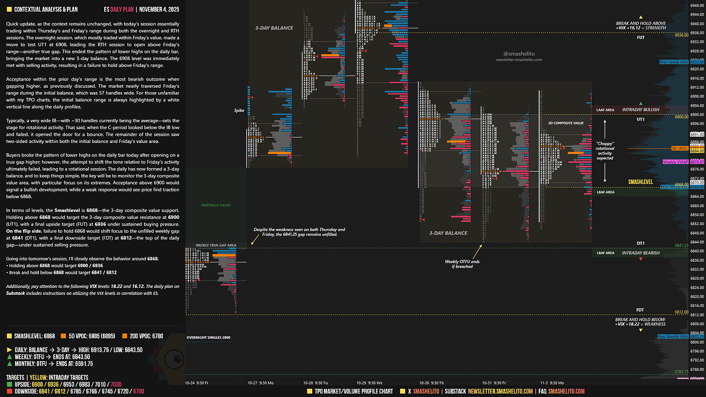 Quick update, as the context remains unchanged, with today’s session essentially trading within Thursday’s and Friday’s range during both the overnight and RTH sessions. The overnight session, which mostly traded within Friday’s value, made a move to test UT1 at 6908, leading the RTH session to open above Friday’s range—another true gap. This ended the pattern of lower highs on the daily bar, bringing the market into a new 3-day balance. The 6908 level was immediately met with selling activity, resulting in a failure to hold above Friday’s range.