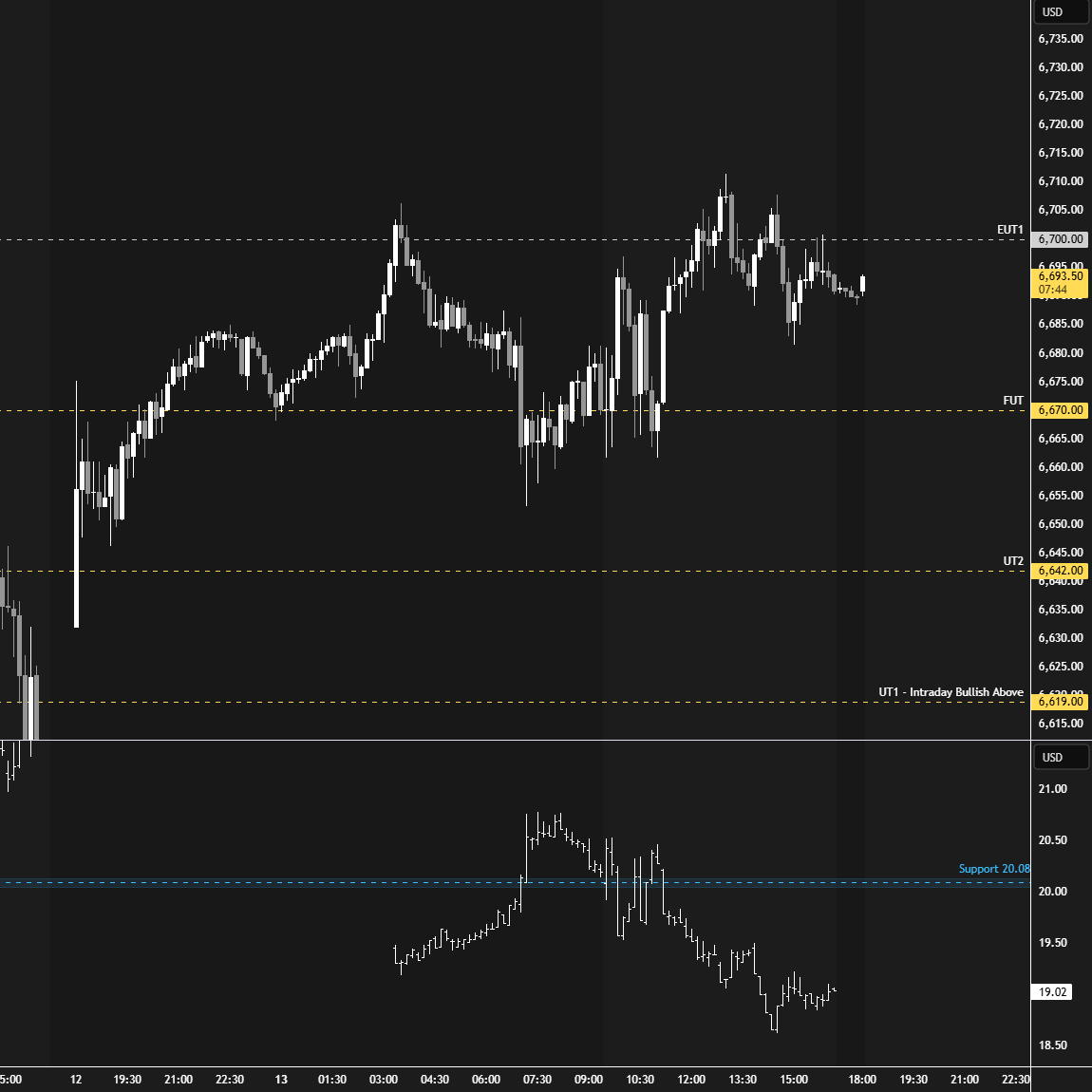 There isn’t much to discuss after today’s session, which opened within Friday’s range and triggered short-covering. The final upside target (FUT) at 6670, marking a HVN, was quickly tagged and exceeded in the overnight session. The VIX held below its support level at 20.08 for most of the RTH session, with buyers defending 6670, making it a tricky environment for sellers.