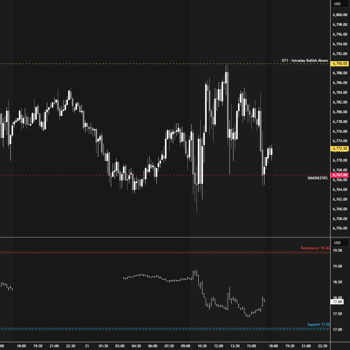 In terms of levels, the Smashlevel is 6767—last week’s high. Holding above 6767 signals strength and targets 6787 (UT1). Acceptance above 6787 would signal further strength, targeting the all-time highs at 6809-12 (UT2), with a final upside target (FUT) at 6828 under sustained buying pressure.