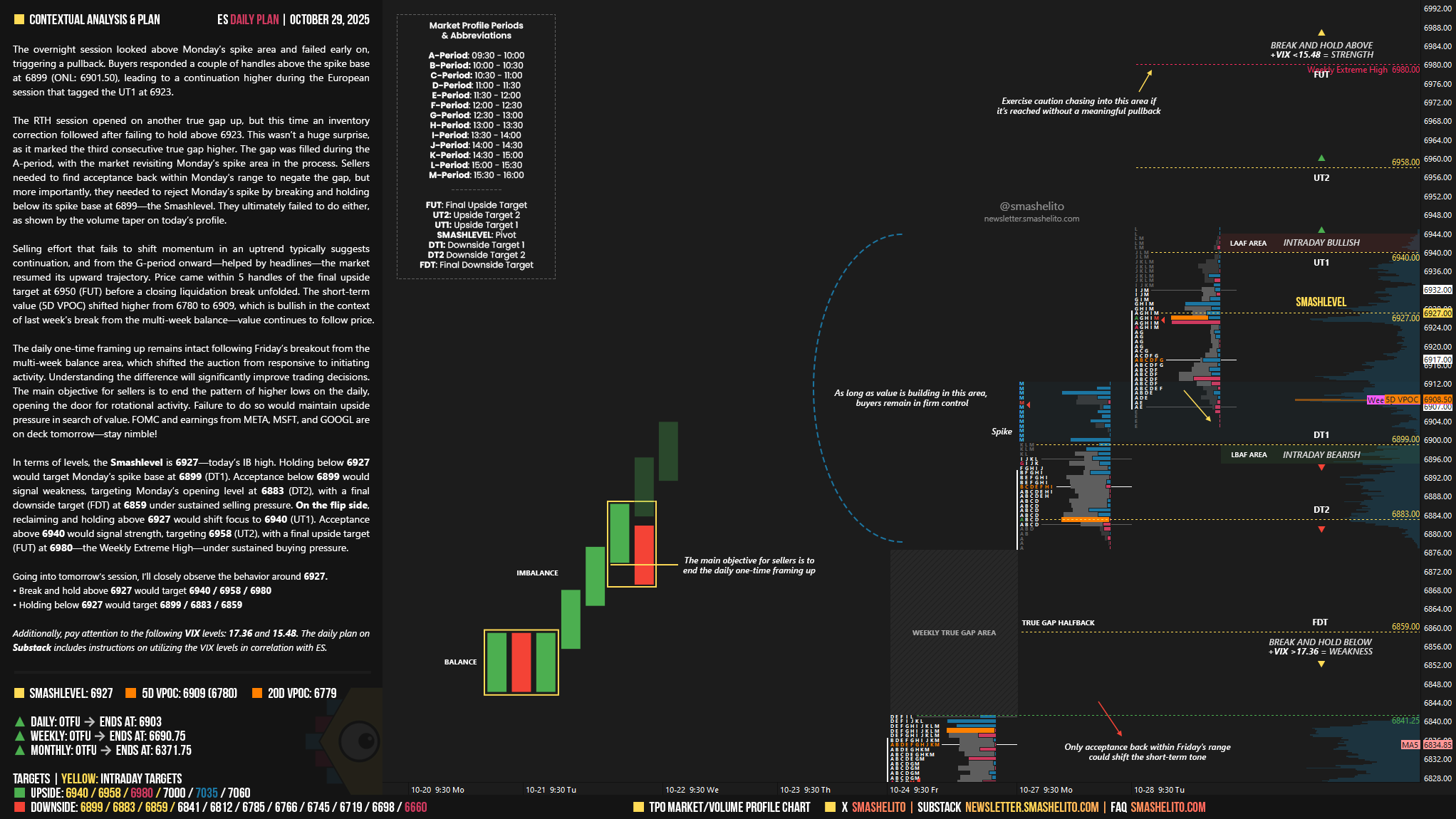 The RTH session opened on another true gap up, but this time an inventory correction followed after failing to hold above 6923. This wasn’t a huge surprise, as it marked the third consecutive true gap higher. The gap was filled during the A-period, with the market revisiting Monday’s spike area in the process. Sellers needed to find acceptance back within Monday’s range to negate the gap, but more importantly, they needed to reject Monday’s spike by breaking and holding below its spike base at 6899—the Smashlevel. They ultimately failed to do either, as shown by the volume taper on today’s profile.
