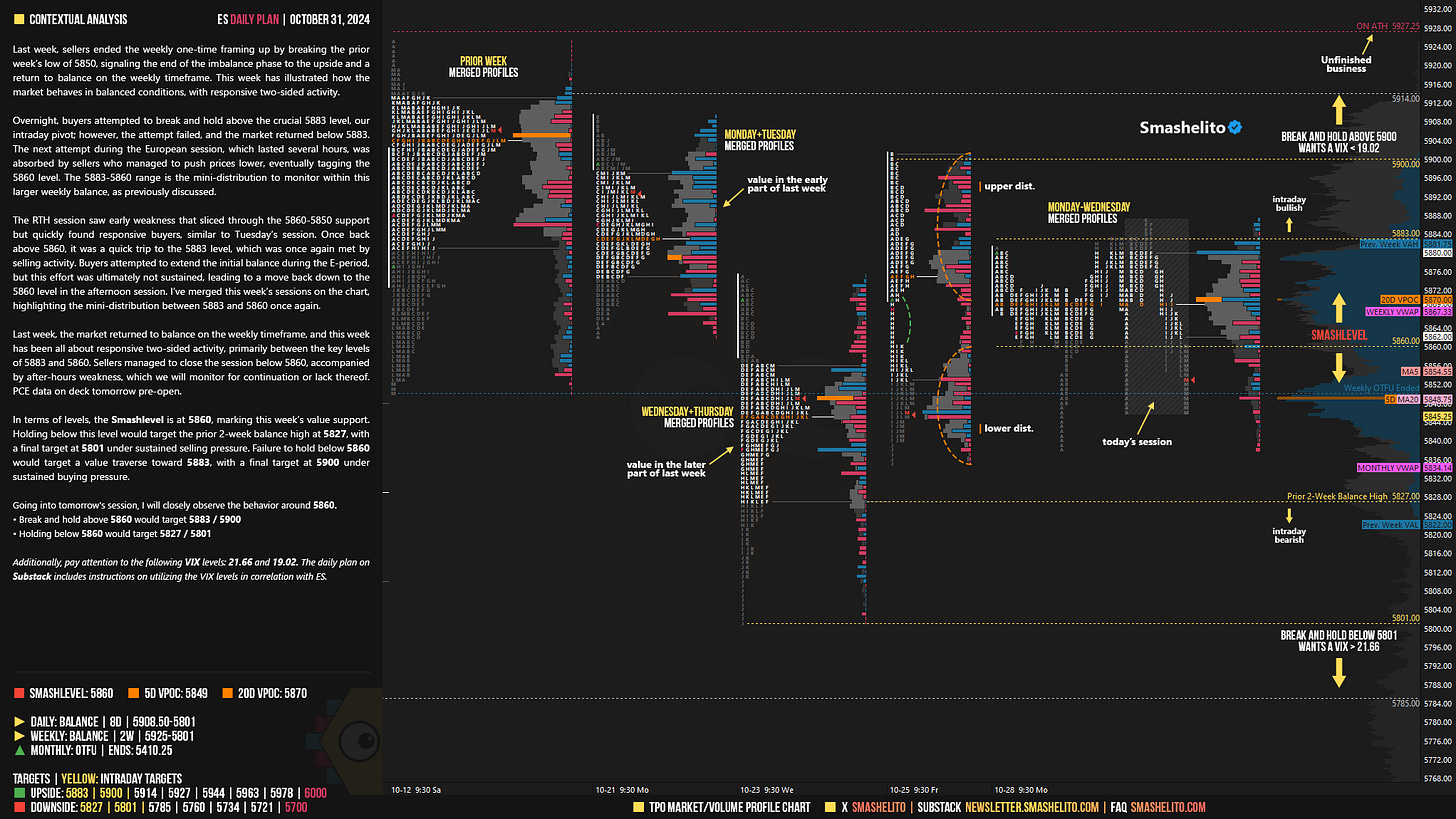 Last week, the market returned to balance on the weekly timeframe, and this week has been all about responsive two-sided activity, primarily between the key levels of 5883 and 5860. Sellers managed to close the session below 5860, accompanied by after-hours weakness, which we will monitor for continuation or lack thereof. PCE data on deck tomorrow pre-open.