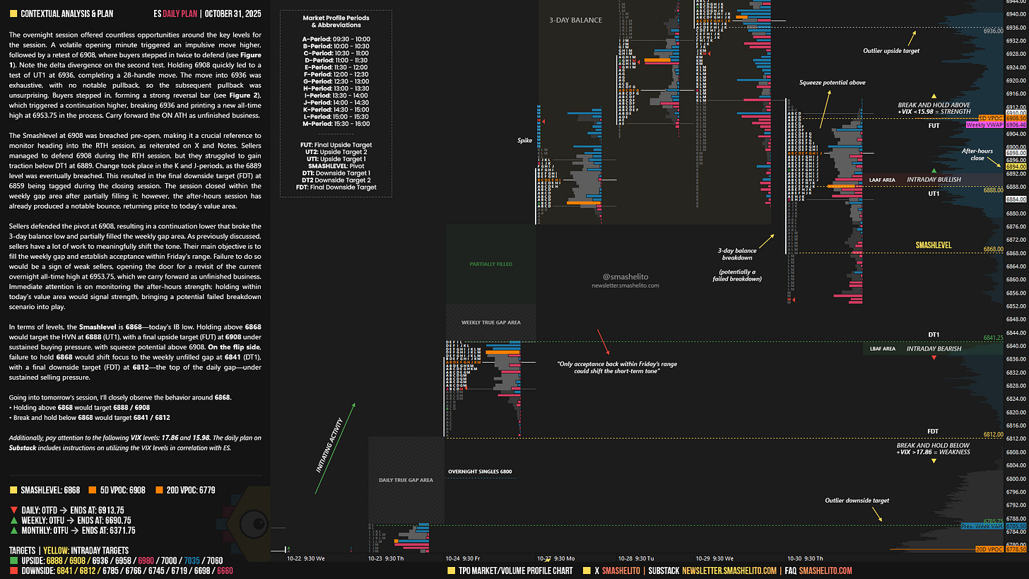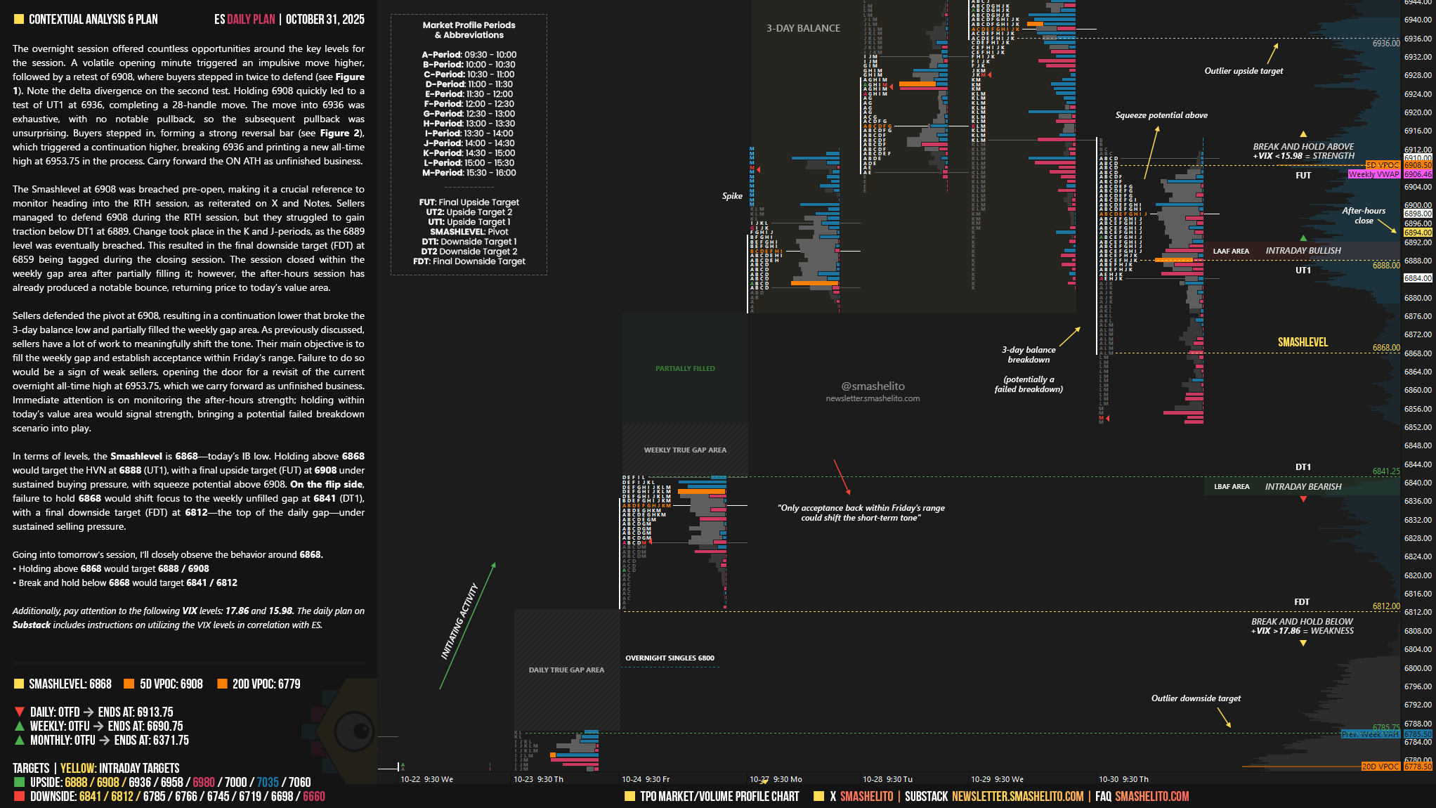 In terms of levels, the Smashlevel is 6868—today’s IB low. Holding above 6868 would target the HVN at 6888 (UT1), with a final upside target (FUT) at 6908 under sustained buying pressure, with squeeze potential above 6908.