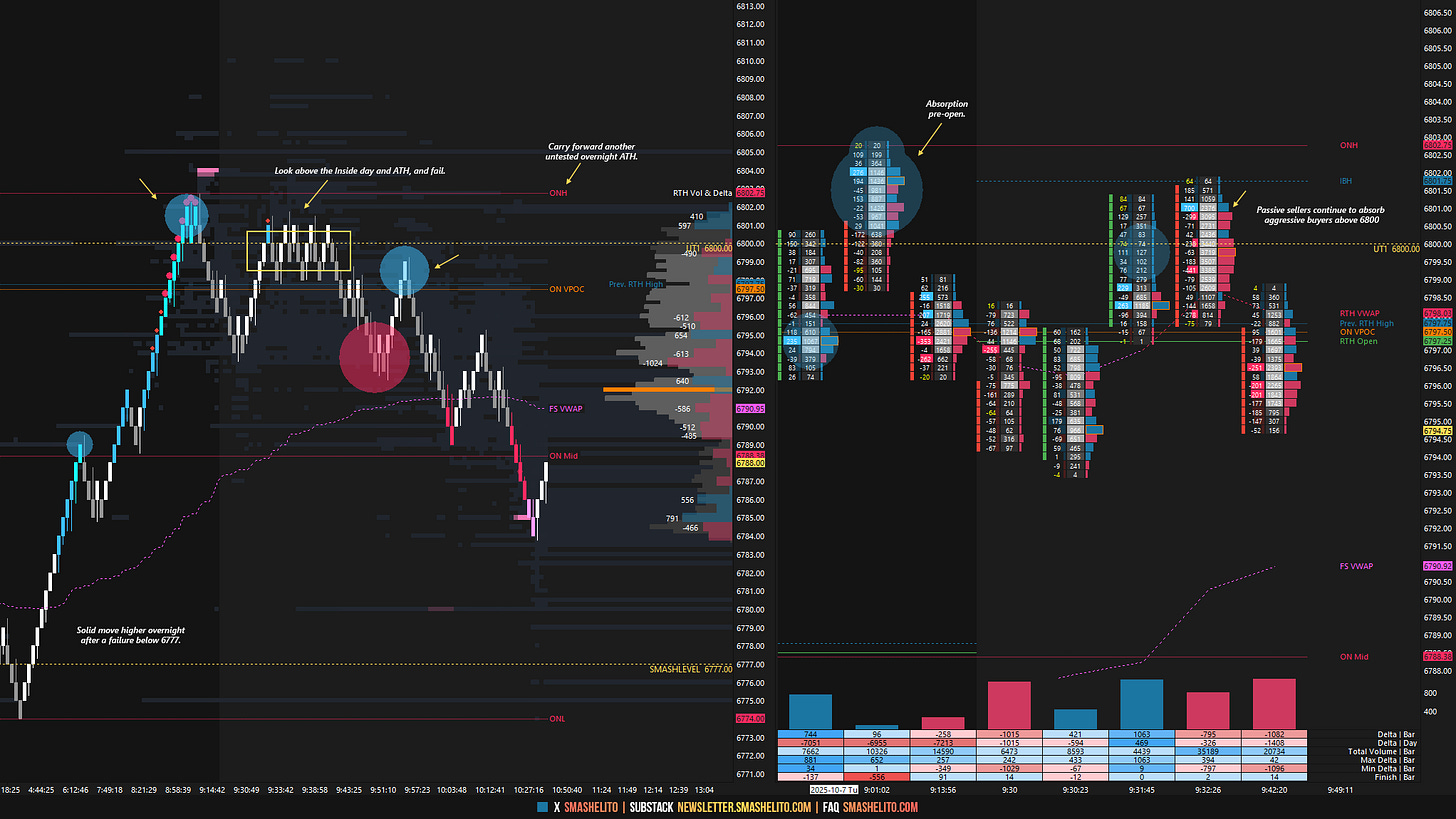 Today’s session offered solid opportunities in both the overnight and RTH sessions. Overnight, the market pulled back to retest the Smashlevel at 6777, where notable aggressive selling was absorbed by passive buyers on Monday. Responsive buyers were active at 6777, providing bounces during both the Asian and European hours—particularly the latter, which resulted in a solid 25-handle move toward UT1 at 6800. For the session to shift into a bullish intraday state, reclaiming 6800 was necessary, which essentially required a sustained inside-day/ATH breakout. Did you notice how aggressive buyers were absorbed above 6800 pre-open?