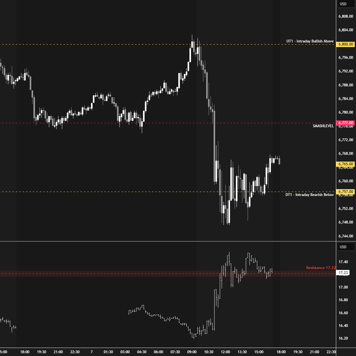 In terms of levels, the Smashlevel is 6776/6767—the D-period single prints. Holding below 6767 targets today’s poor low at 6747 (DT1). Acceptance below 6747 signals weakness, targeting 6732 (UT2), with a final downside target (FDT) at 6712 under sustained selling pressure.