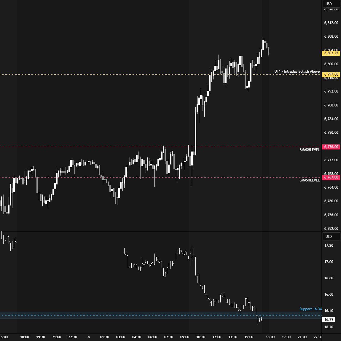 Break and hold above 6863 with VIX below 15.38 would confirm strength.