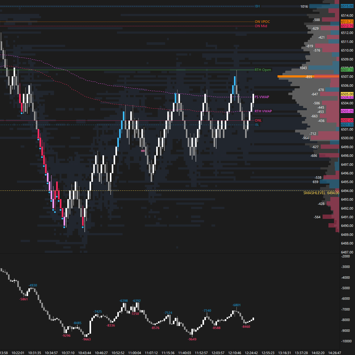 The key levels today were 6523, which capped the upside during the overnight session, and the Smashlevel at 6494, which marked the upper end of Friday’s session and attracted responsive buyers during the RTH session. The overnight session was quiet overall, aside from an opening push higher at the start of the European session that tested 6523, where sellers were active (ONH: 6523.50).