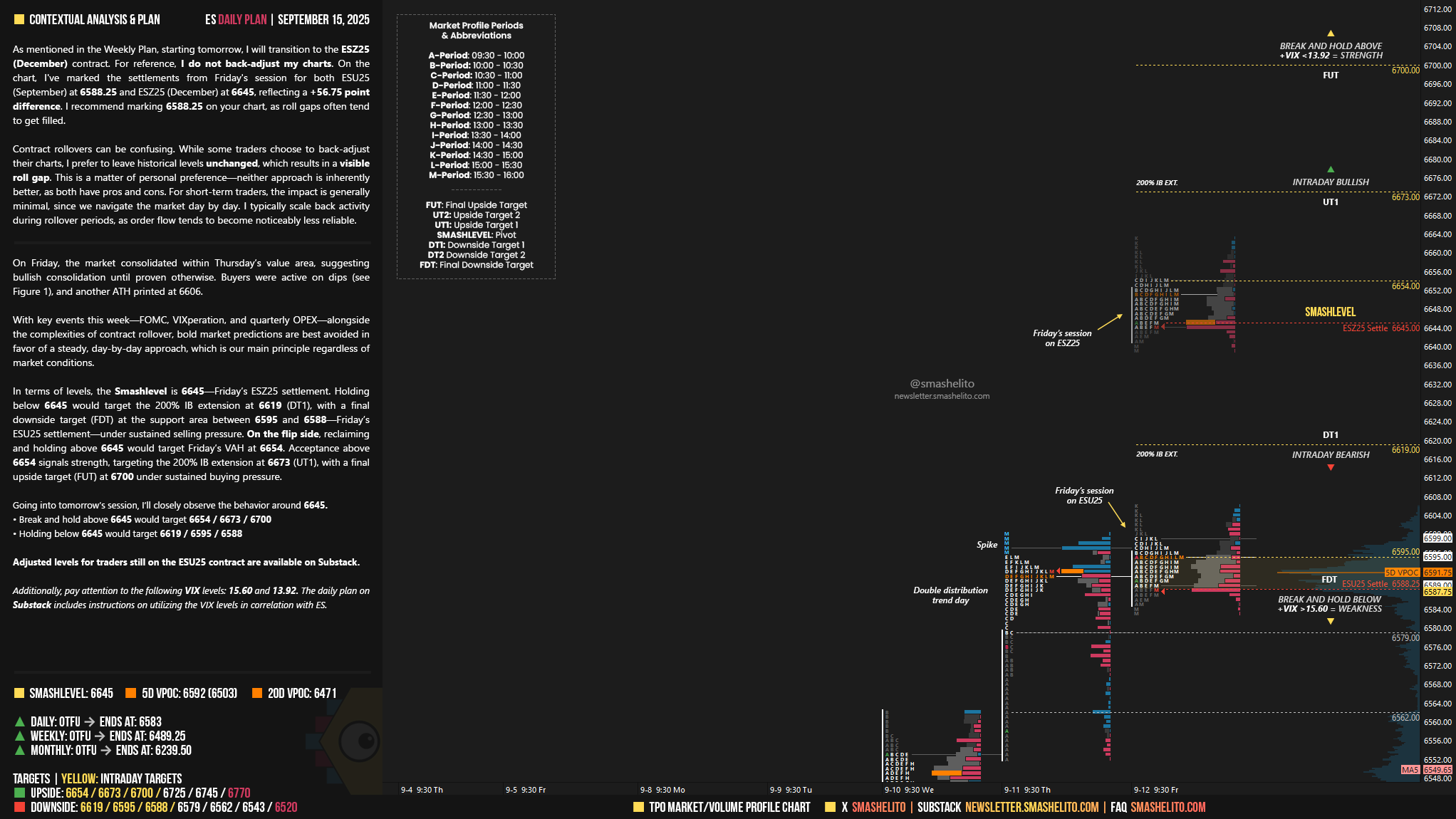 As mentioned in the Weekly Plan, starting tomorrow, I will transition to the ESZ25 (December) contract. For reference, I do not back-adjust my charts. On the chart, I've marked the settlements from Friday's session for both ESU25 (September) at 6588.25 and ESZ25 (December) at 6645, reflecting a +56.75 point difference. I recommend marking 6588.25 on your chart, as roll gaps often tend to get filled.