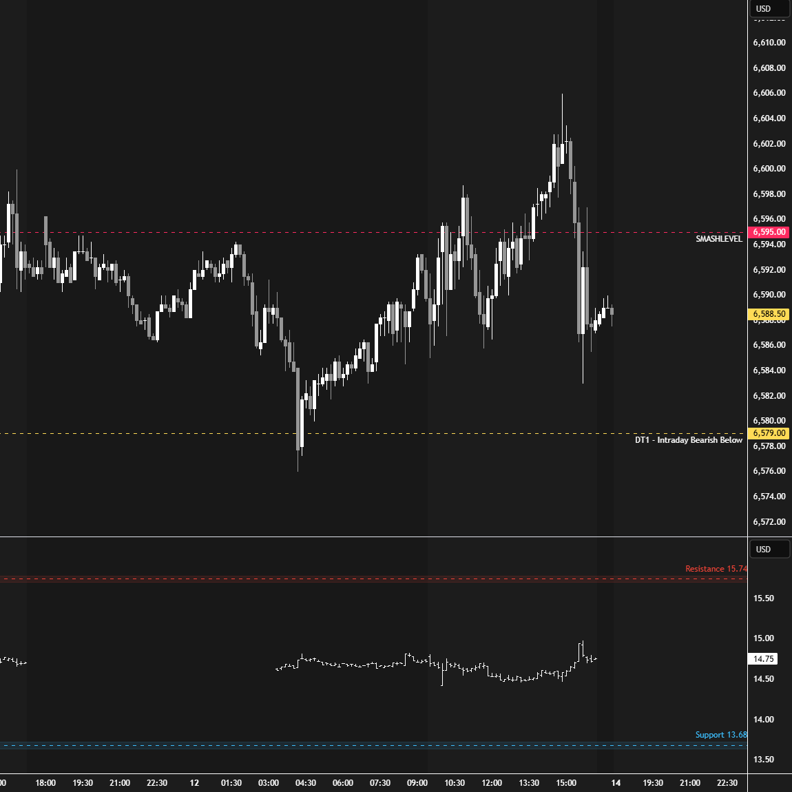 Break and hold below 6588 with VIX above 15.60 would confirm weakness.