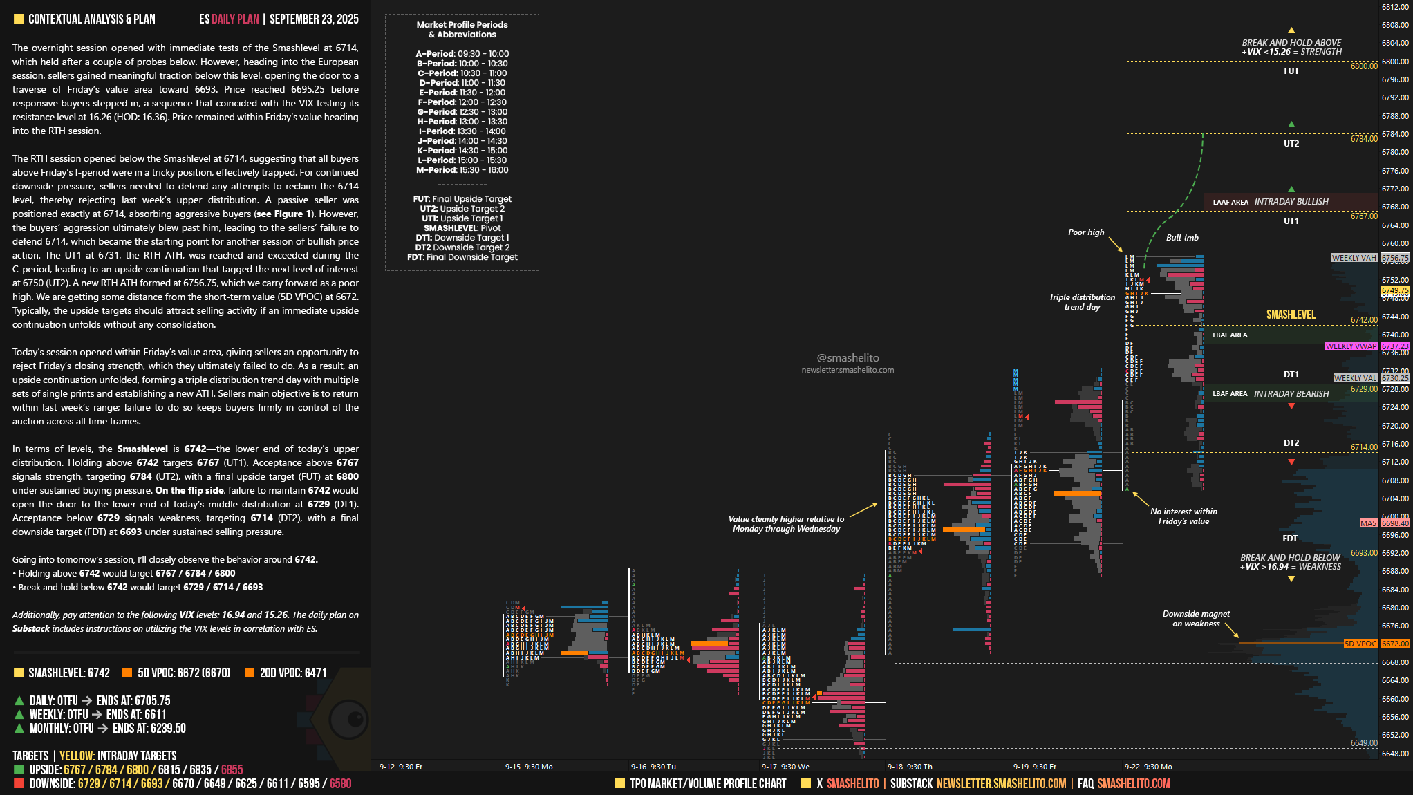 In terms of levels, the Smashlevel is 6742—the lower end of today’s upper distribution. Holding above 6742 targets 6767 (UT1). Acceptance above 6767 signals strength, targeting 6784 (UT2), with a final upside target (FUT) at 6800 under sustained buying pressure.