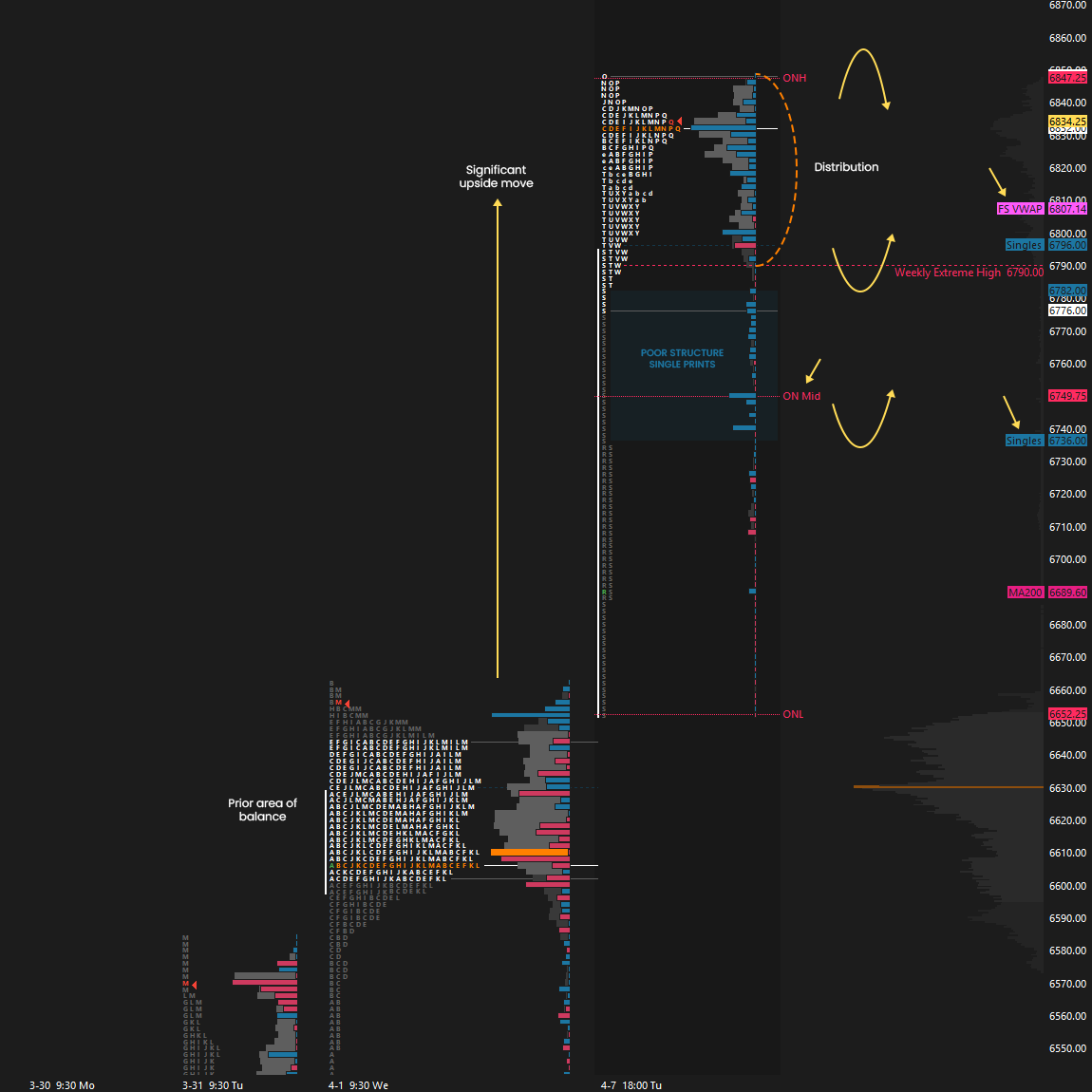 The key during Wednesday’s RTH session, and basically for the rest of the week, was to monitor the Weekly Extreme High at 6790, which aligned with the low of the distribution formed Wednesday pre-market (see Figure 3).