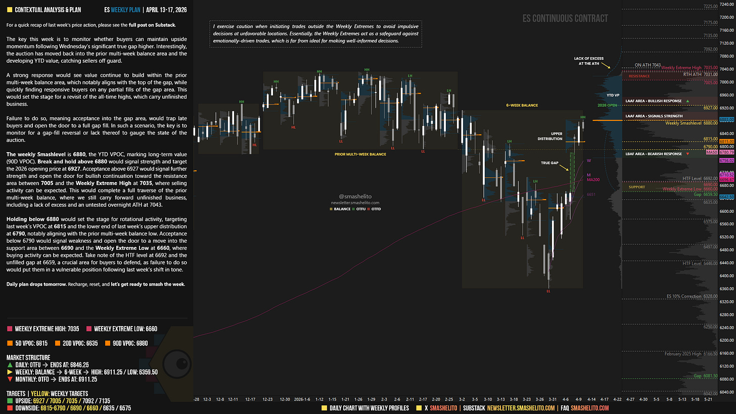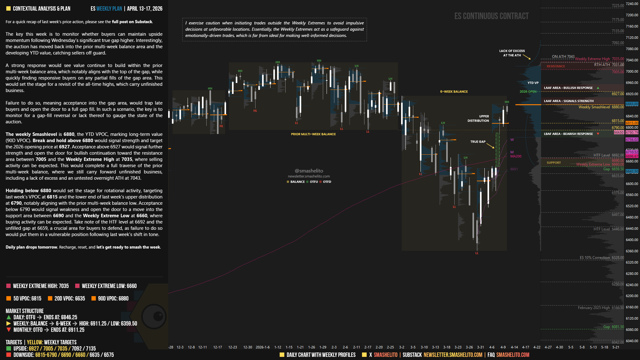 The weekly Smashlevel is 6880, the YTD VPOC, marking long-term value (90D VPOC). Break and hold above 6880 would signal strength and target the 2026 opening price at 6927. Acceptance above 6927 would signal further strength and open the door for bullish continuation toward the resistance area between 7005 and the Weekly Extreme High at 7035, where selling activity can be expected. This would complete a full traverse of the prior multi-week balance, where we still carry forward unfinished business, including a lack of excess and an untested overnight ATH at 7043.