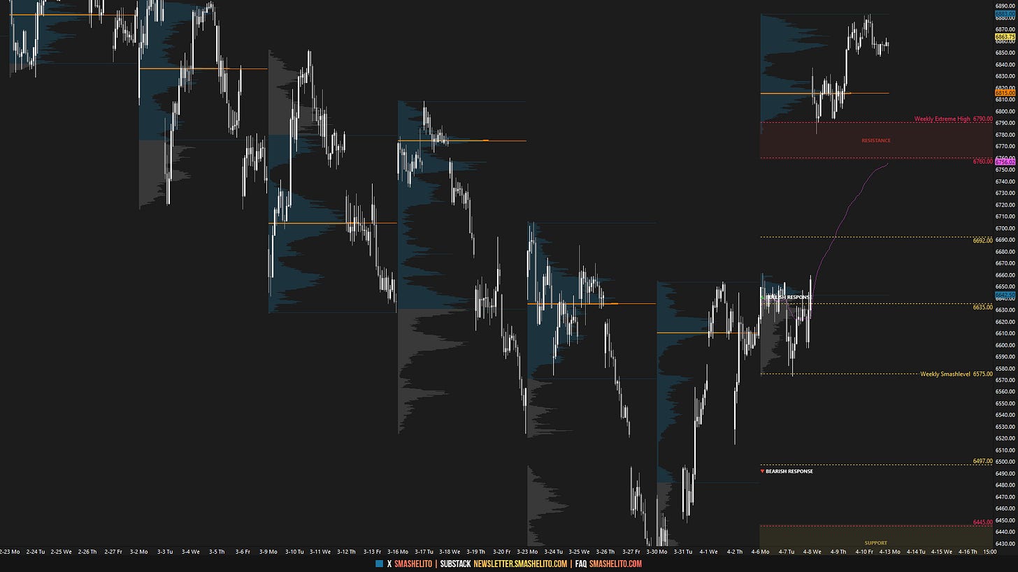 Last week, the key focus was whether buyers could maintain upside momentum following the double distribution trend day on Thursday, April 2. The key level was 6575, marking the breakout single prints separating the two distributions.
