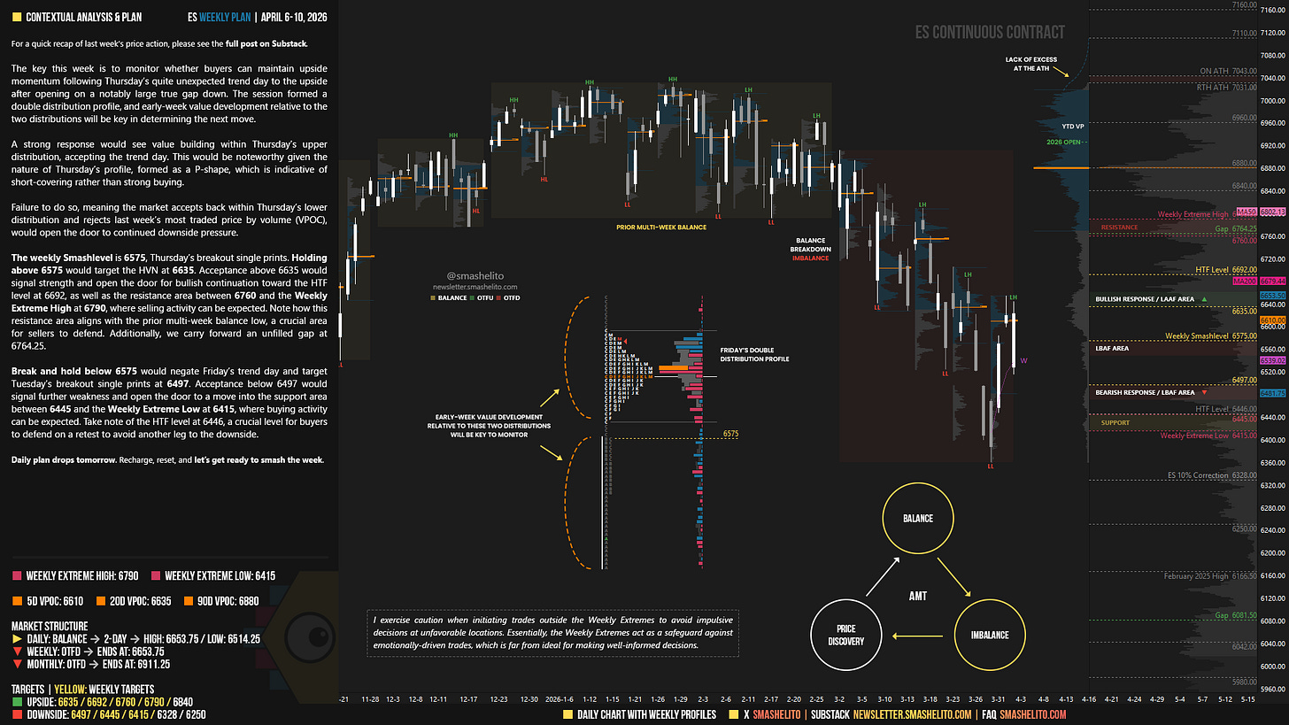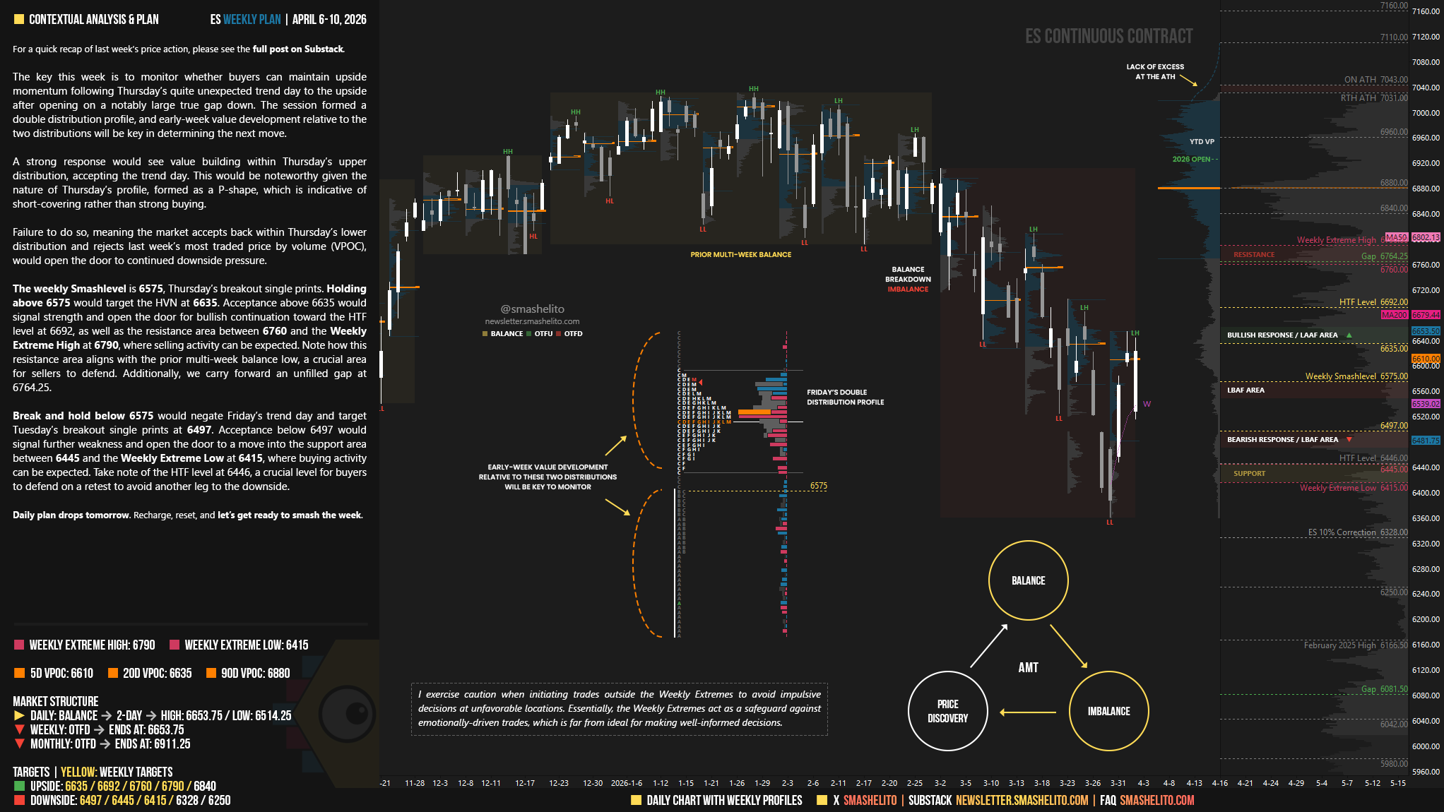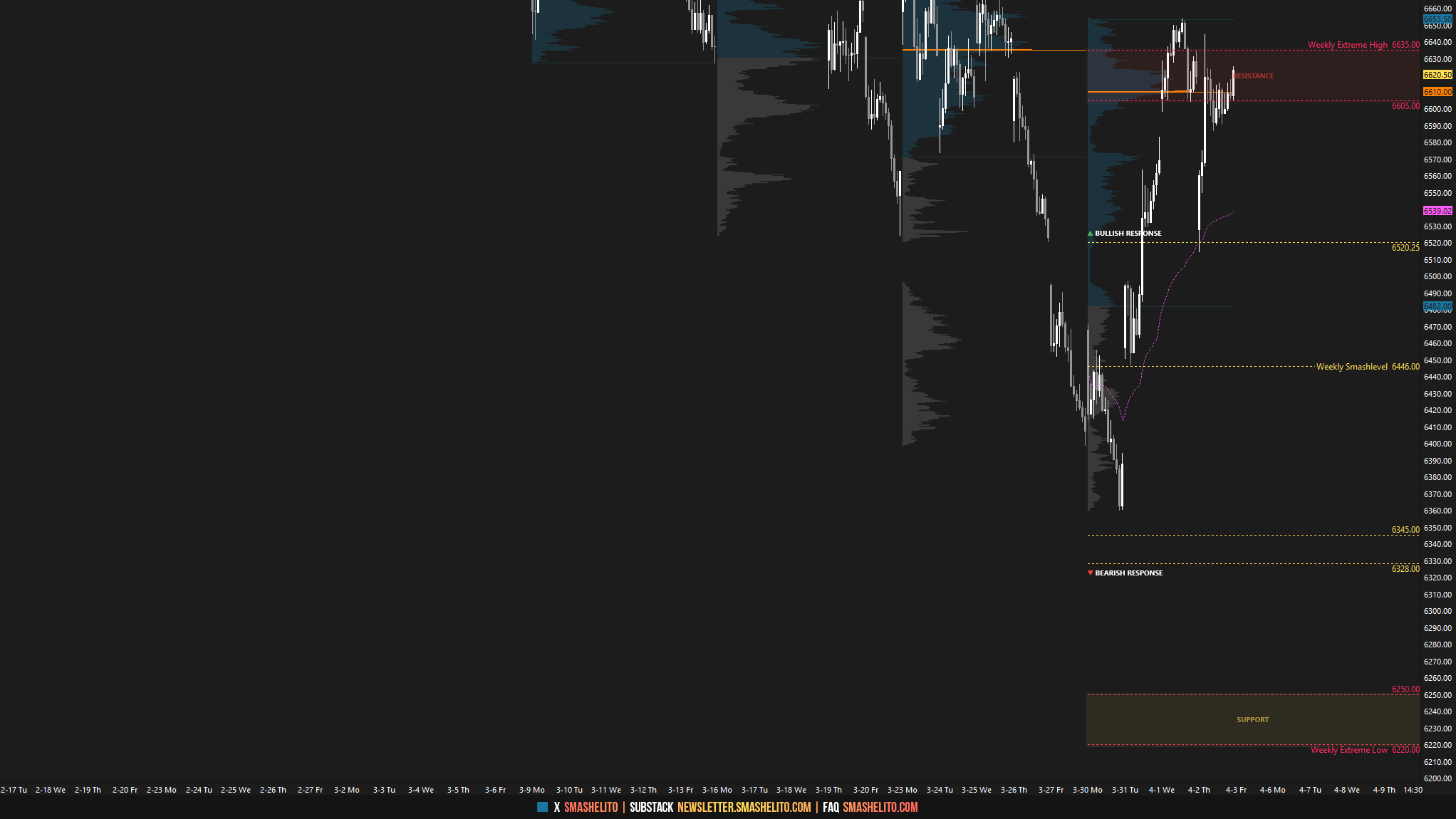 The weekly Smashlevel is 6575, Thursday’s breakout single prints. Holding above 6575 would target the HVN at 6635. Acceptance above 6635 would signal strength and open the door for bullish continuation toward the HTF level at 6692, as well as the resistance area between 6760 and the Weekly Extreme High at 6790, where selling activity can be expected. Note how this resistance area aligns with the prior multi-week balance low, a crucial area for sellers to defend. Additionally, we carry forward an unfilled gap at 6764.25.