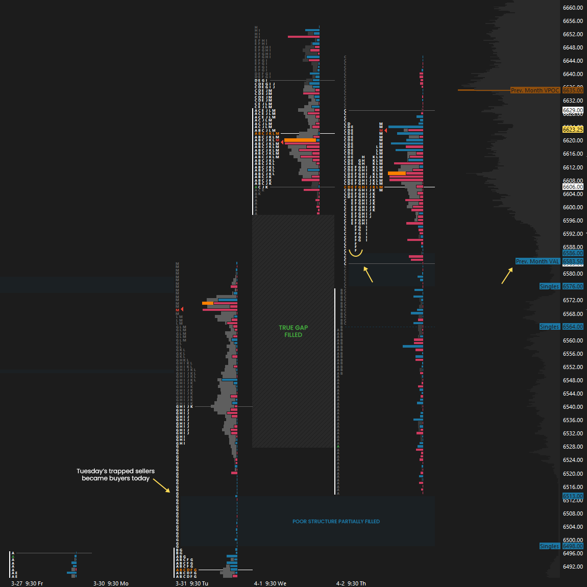 Tuesday’s strength was followed by a sustained true gap up on Wednesday, pushing the auction into the 6605–6635 weekly resistance area. The 6635 high volume node was identified as a potential upside magnet in the absence of early weakness and remained pivotal for the rest of the week.