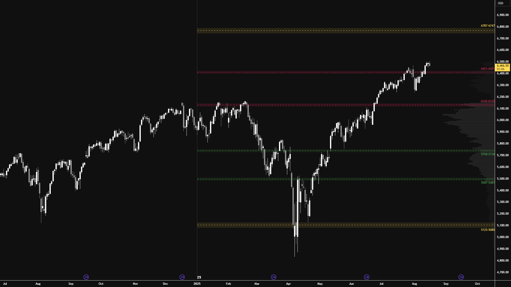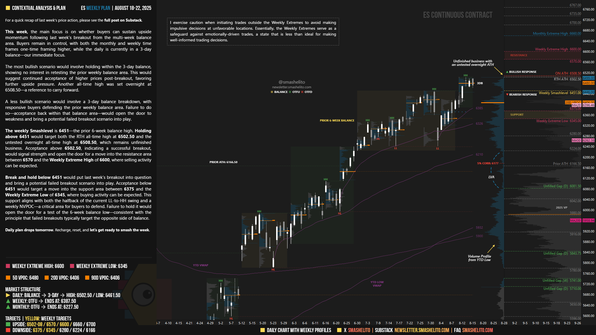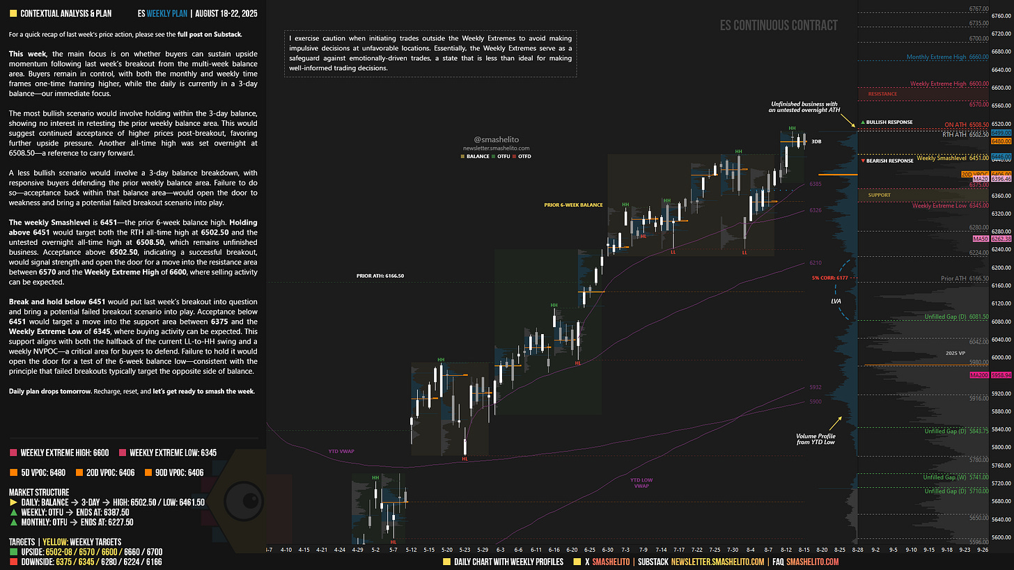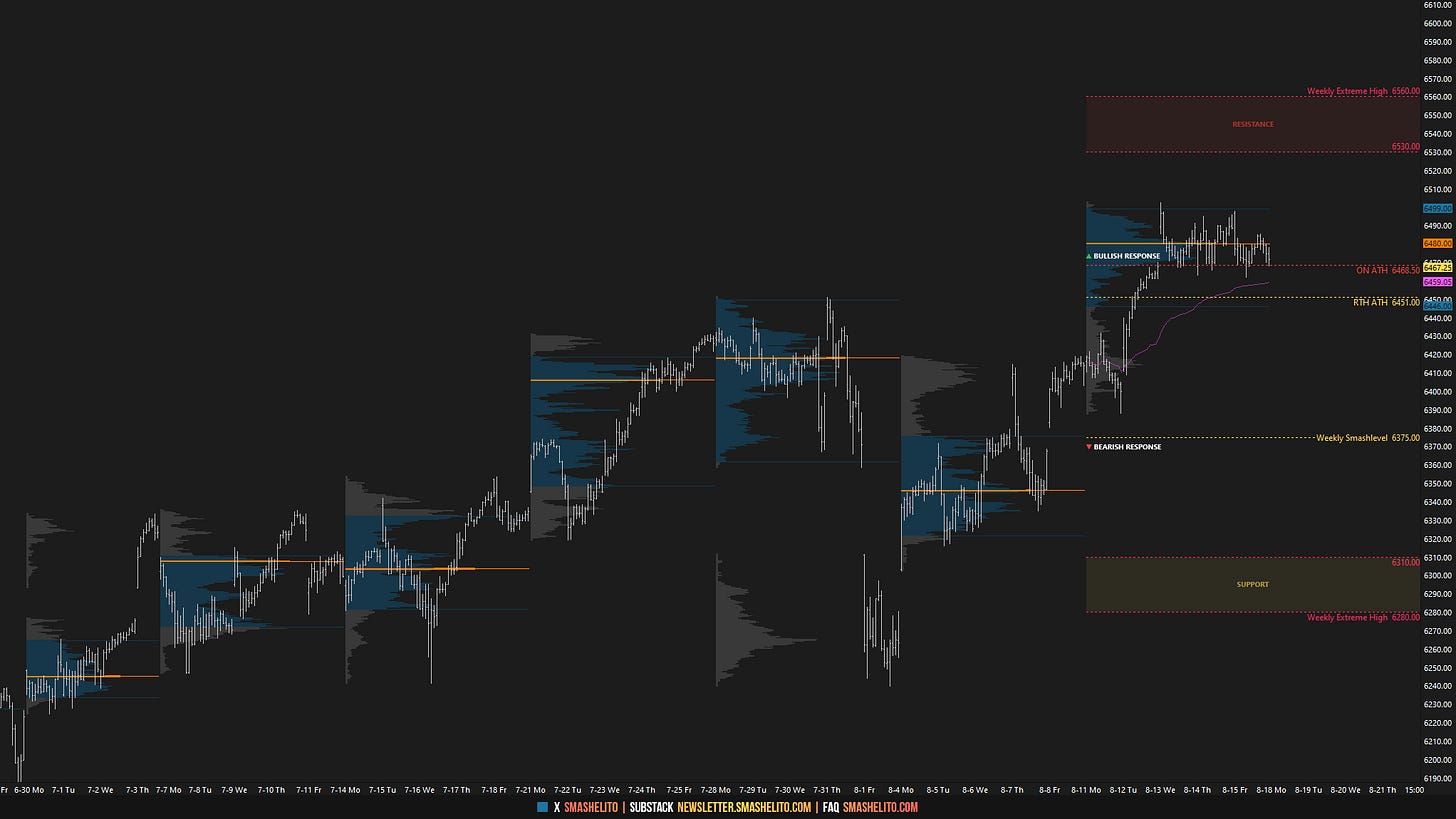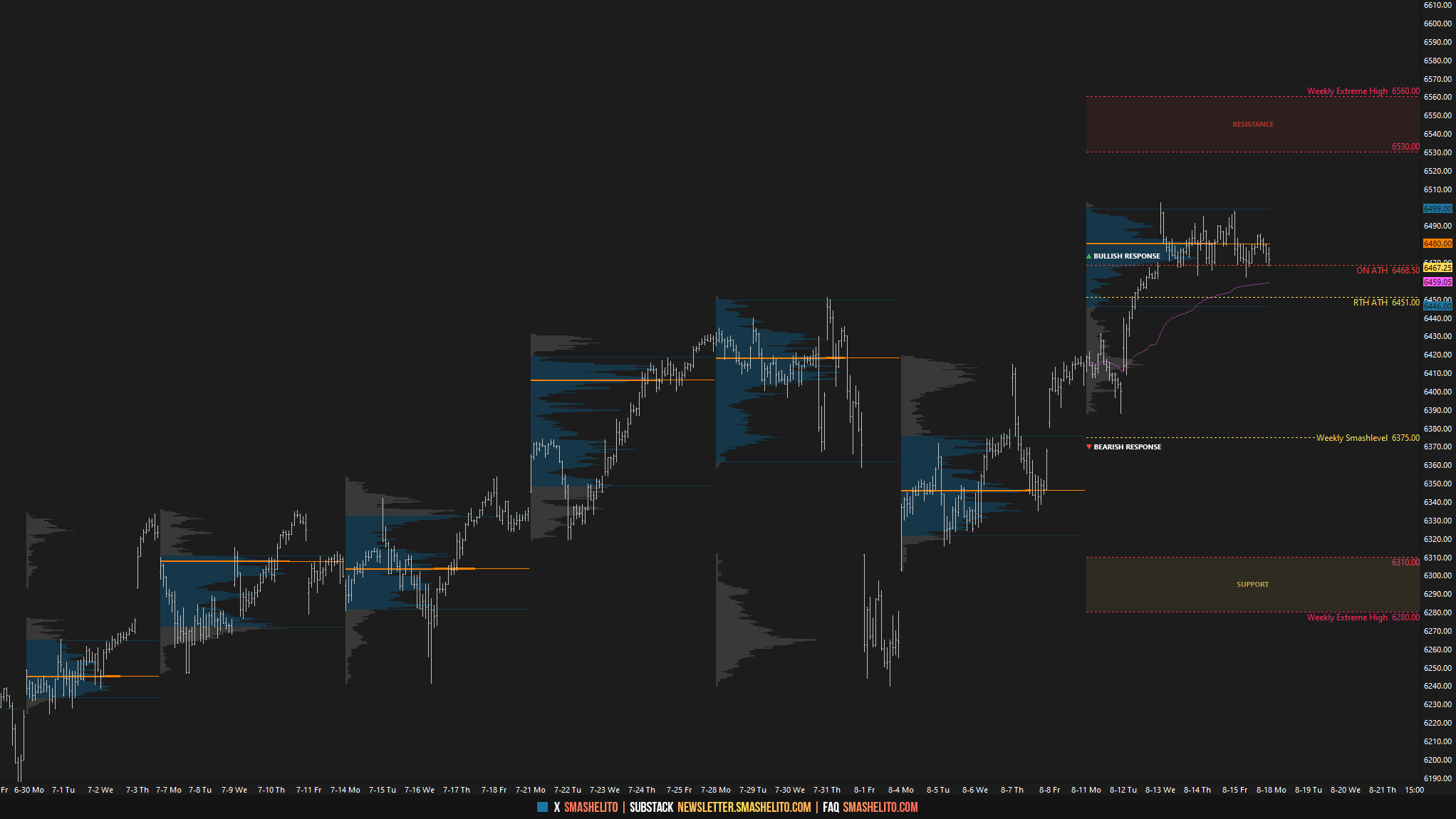 The weekly Smashlevel is 6451—the prior 6-week balance high. Holding above 6451 would target both the RTH all-time high at 6502.50 and the untested overnight all-time high at 6508.75, which remains unfinished business. Acceptance above 6502.50, indicating a successful breakout, would signal strength and open the door for a move into the resistance area between 6570 and the Weekly Extreme High of 6600, where selling activity can be expected.