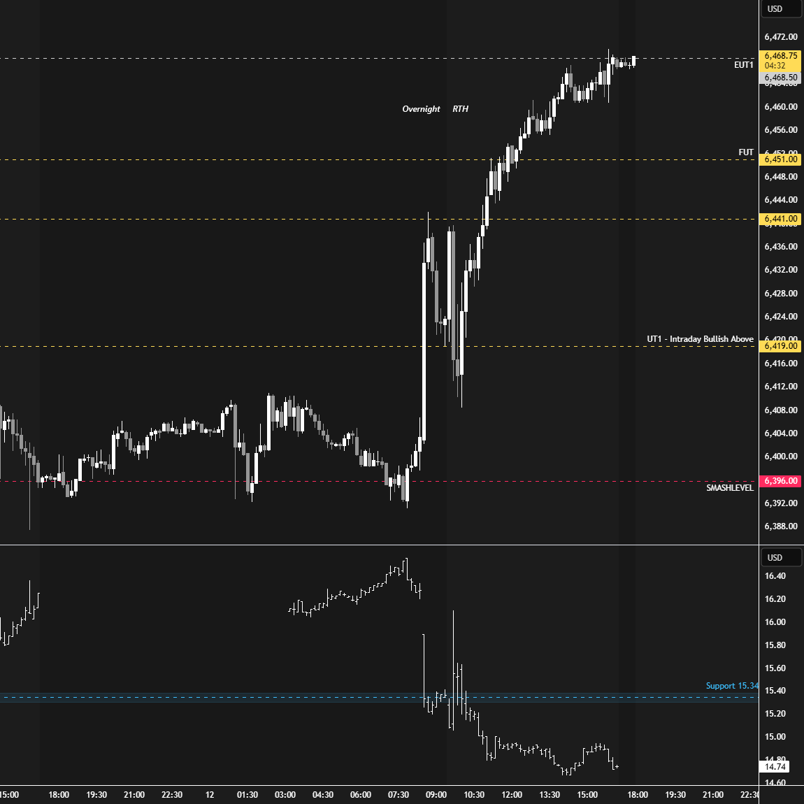 On Thursday, similar to Tuesday’s session, the overnight session was quiet, with buyers defending the Smashlevel at 6480 ahead of the PPI data release. Following the release, the market dropped 35 handles before finding responsive buyers, resulting in a notable reversal. The VIX nearly tagged its resistance level at 15.42 during this sequence, which was noteworthy. Sellers ended the daily one-time framing up, forming a 2-day balance heading into Friday’s session.