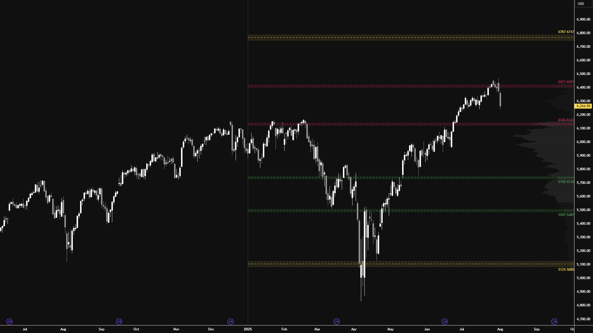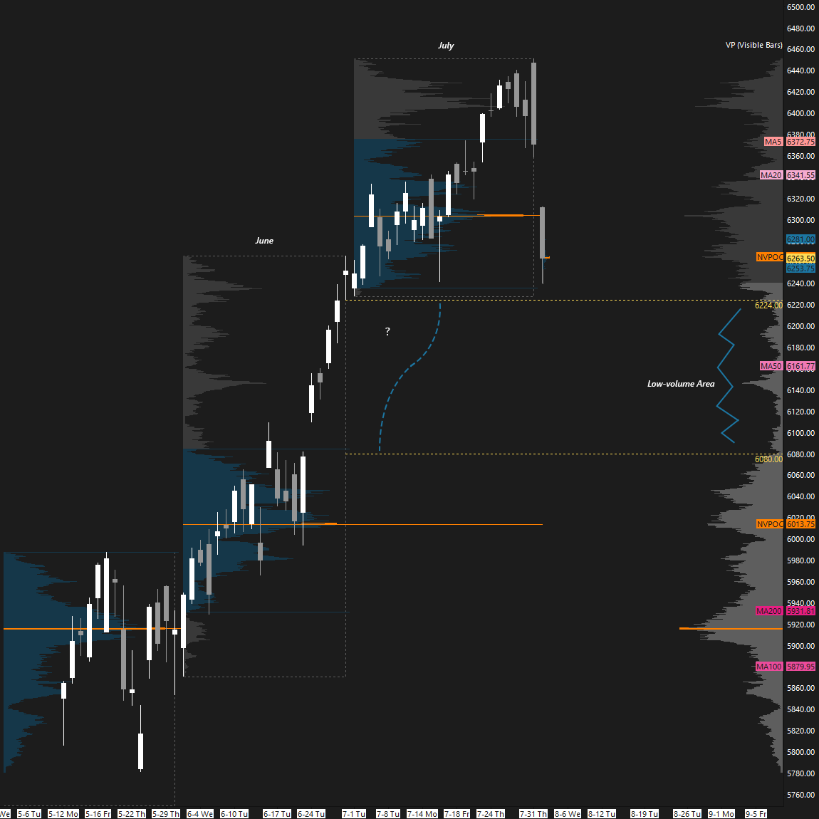 Holding below 6304 keeps downside pressure intact, with the 5-week balance low at 6224 as the initial target—a potential look-below-and-fail area if tested immediately. Acceptance below 6224 would signal further weakness, targeting the prior all-time high at 6166.50, followed by a potential move into the support area between 6115 and the Weekly Extreme Low of 6080, where buying activity can be expected. This support area aligns with the unfilled gap at 6081.50 and closely with the 5% correction level at 6129. Also worth noting is the low-volume area between 6224 and 6080—a healthy pullback could fill this structure but ideally not find acceptance below 6080, where another high-volume area begins (see Figure 2), making it a critical area for buyers to defend.