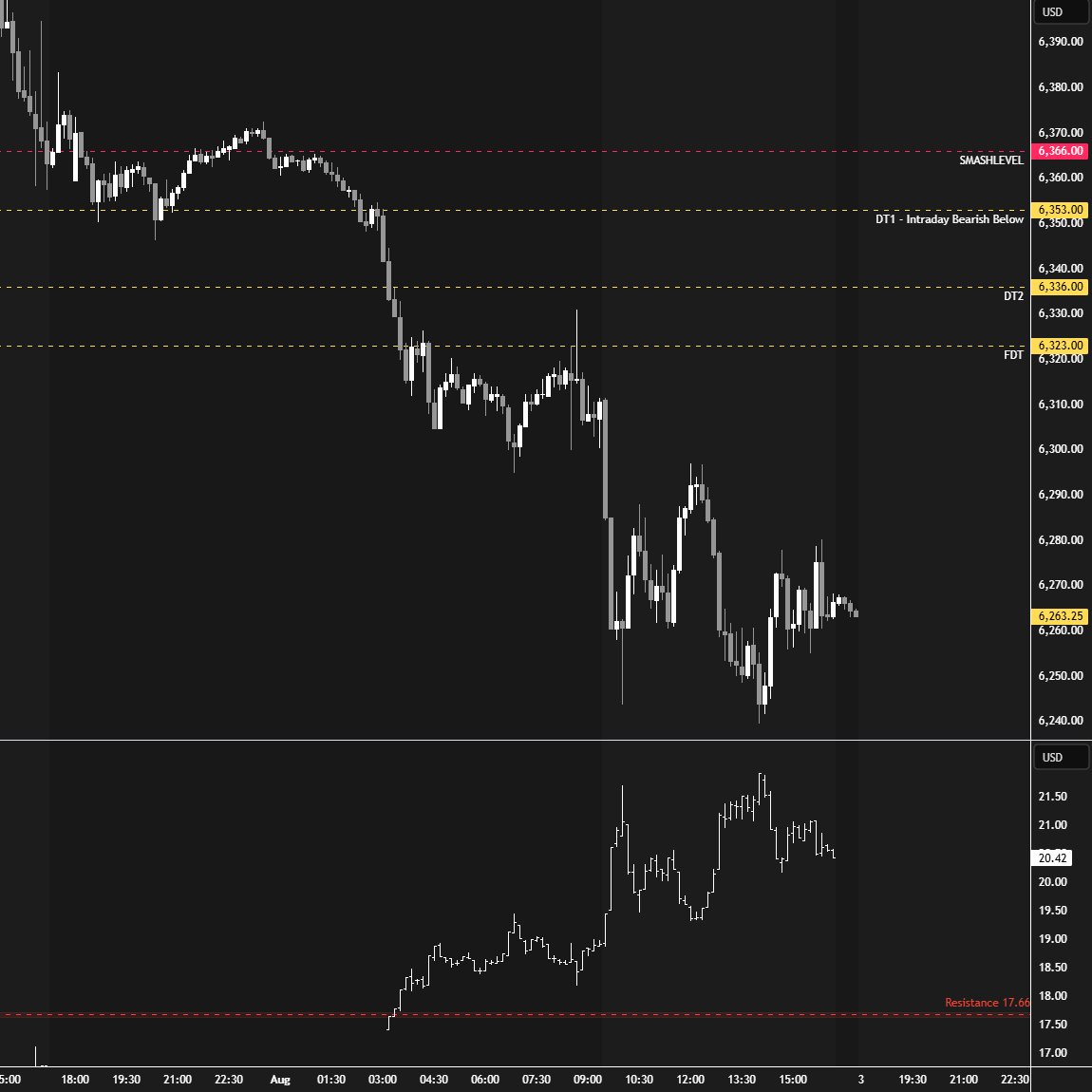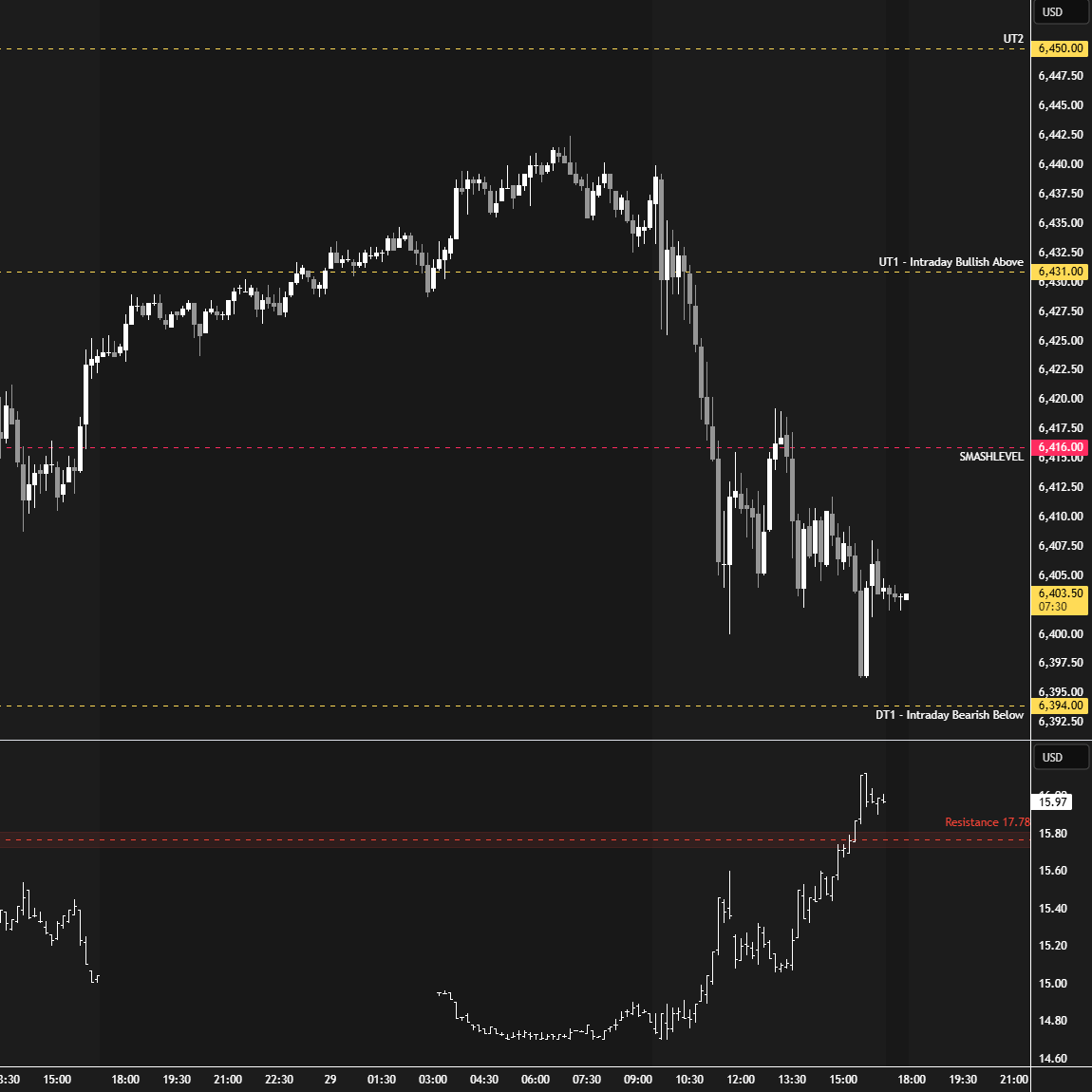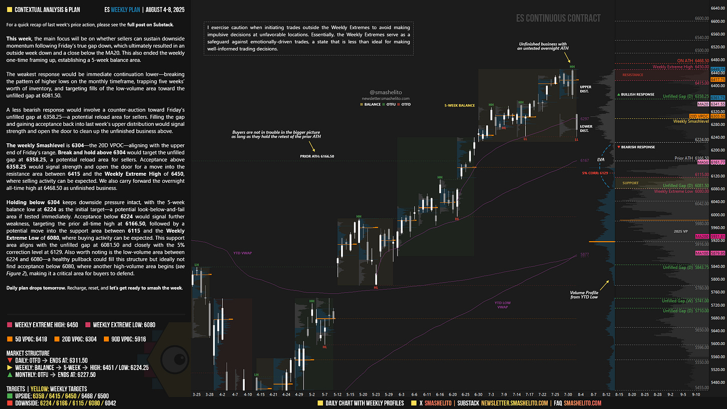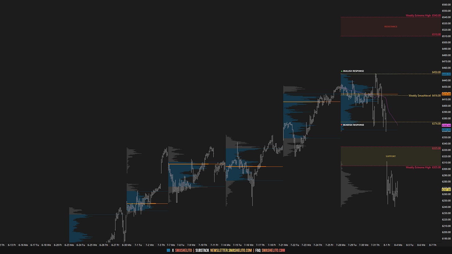 The weekly Smashlevel is 6304—the 20D VPOC—aligning with the upper end of Friday’s range. Break and hold above 6304 would target the unfilled gap at 6358.25, a potential reload area for sellers. Acceptance above 6358.25 would signal strength and open the door for a move into the resistance area between 6415 and the Weekly Extreme High of 6450, where selling activity can be expected. We also carry forward the overnight all-time high at 6468.50 as unfinished business.