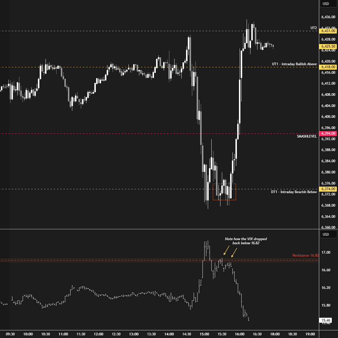 On Wednesday, trading remained uneventful until the FOMC meeting, during which a nasty liquidation break unfolded, pushing the market out of balance. In the process, the key level at 6374—where change took place the prior week—was tagged, offering a great reversal opportunity in confluence with the intraday VIX levels outlined in each daily plan.