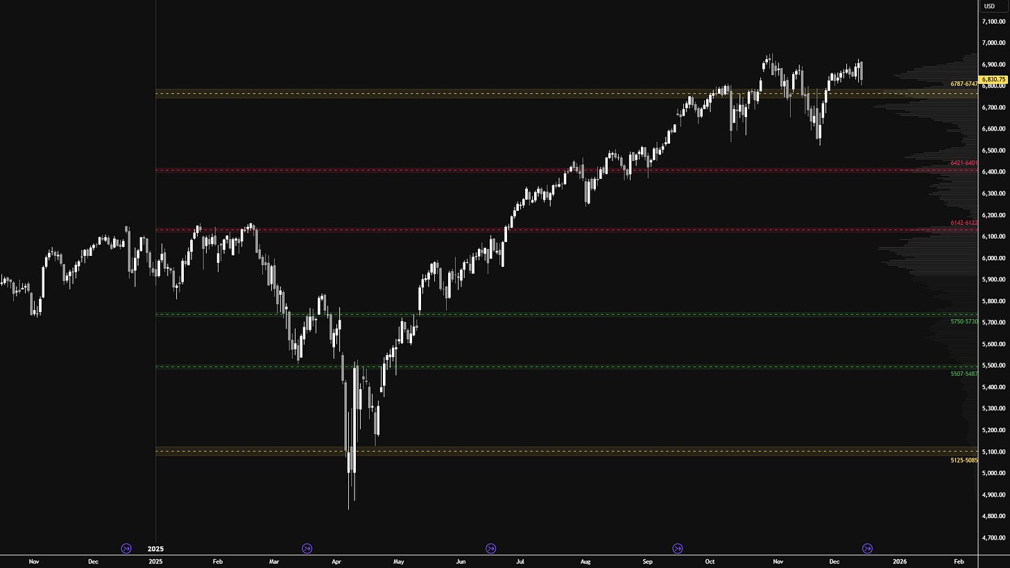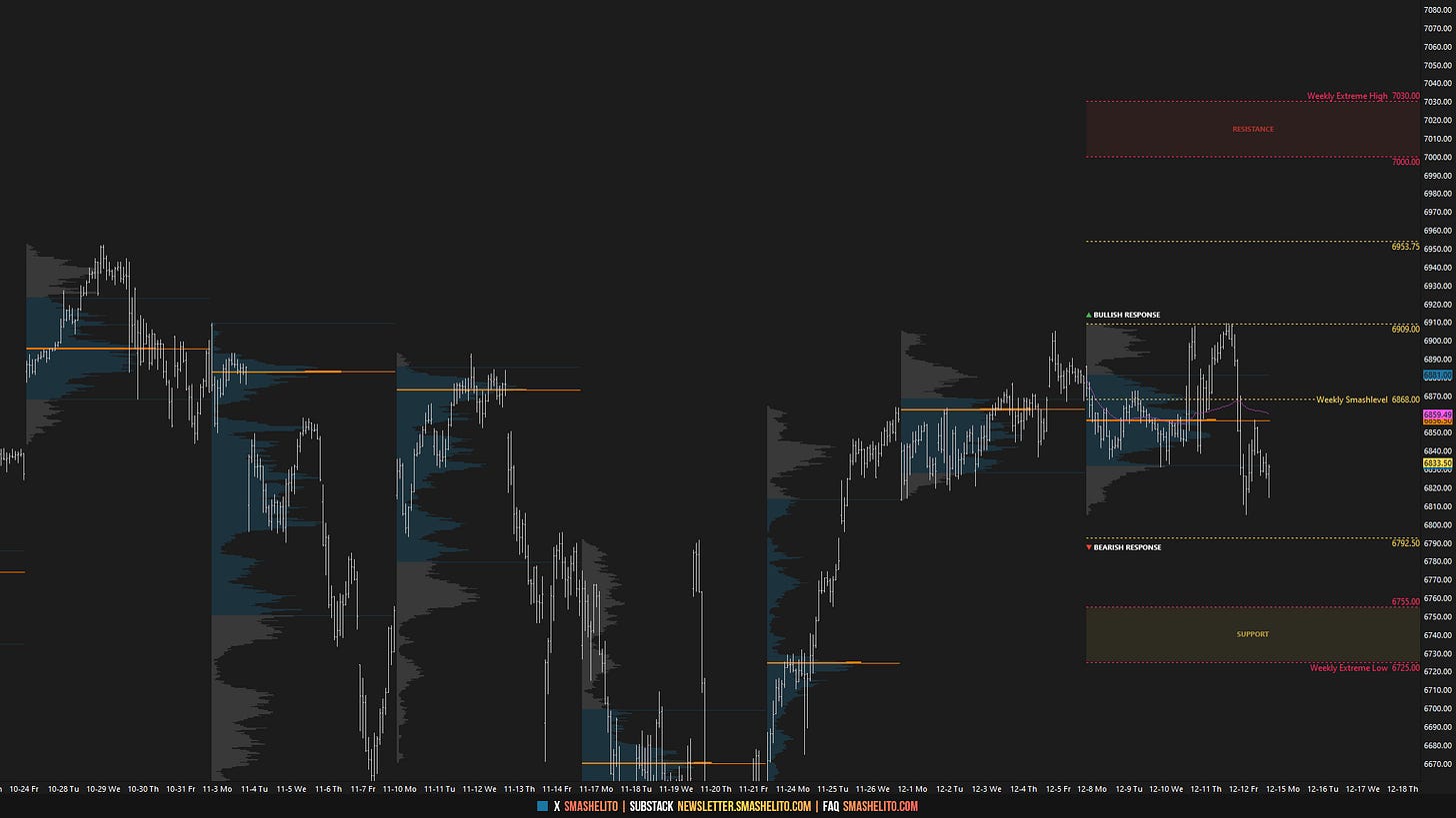 Coming into last week, the key question was whether buyers could sustain upside momentum and extend the pattern of higher lows on the daily chart after Friday retraced its opening strength on December 5. Strength required value to build above the prior week’s VAH at 6868, while failure to do so would open the door for a move toward the unfilled gap at 6792.50.