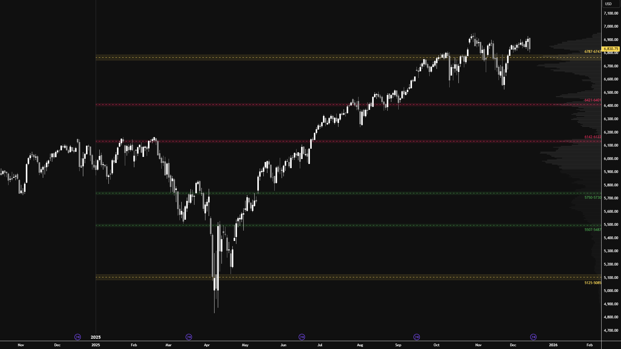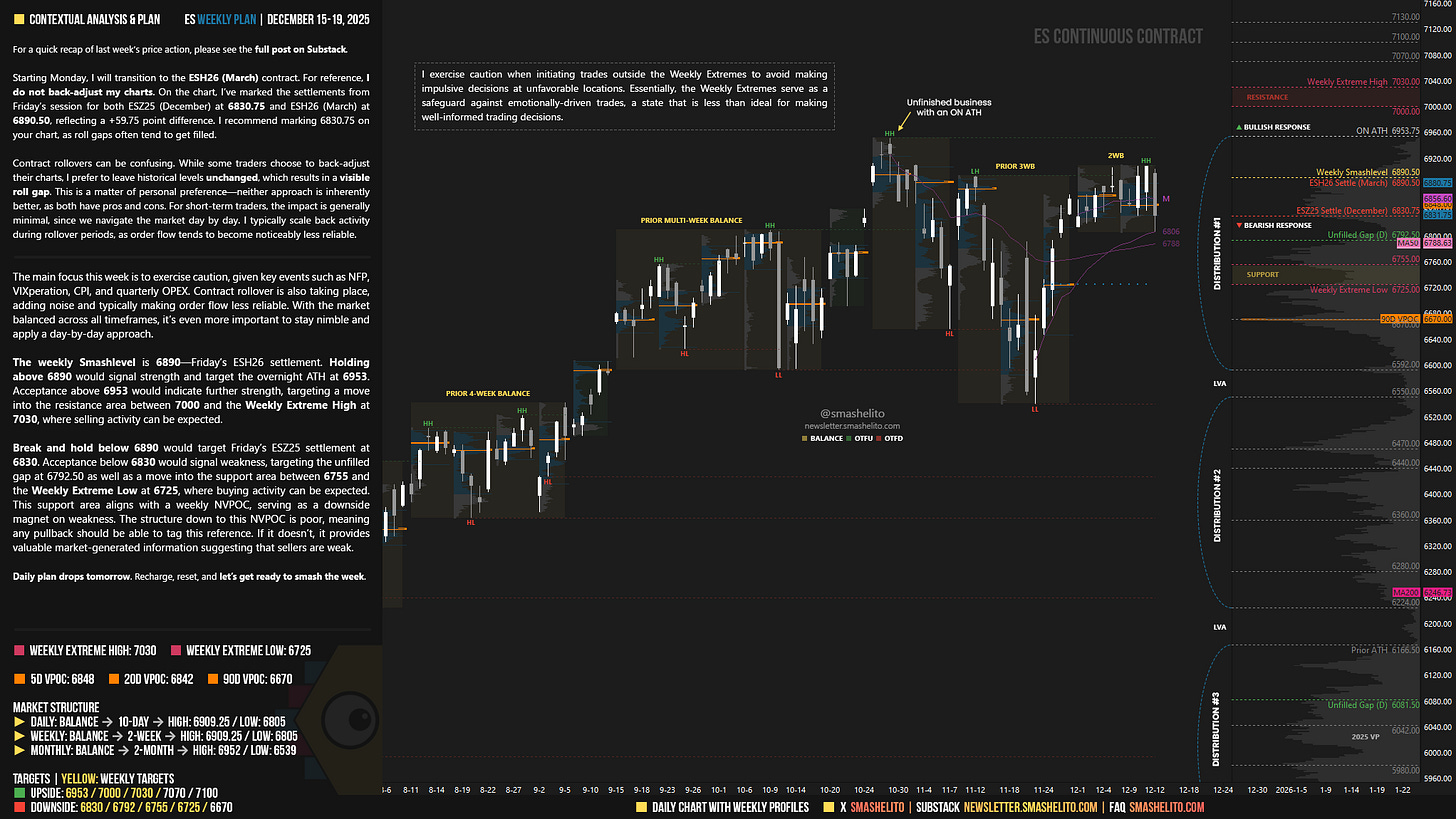 Starting Monday, I will transition to the ESH26 (March) contract. For reference, I do not back-adjust my charts. On the chart, I’ve marked the settlements from Friday’s session for both ESZ25 (December) at 6830.75 and ESH26 (March) at 6890.50, reflecting a +59.75 point difference. I recommend marking 6830.75 on your chart, as roll gaps often tend to get filled.